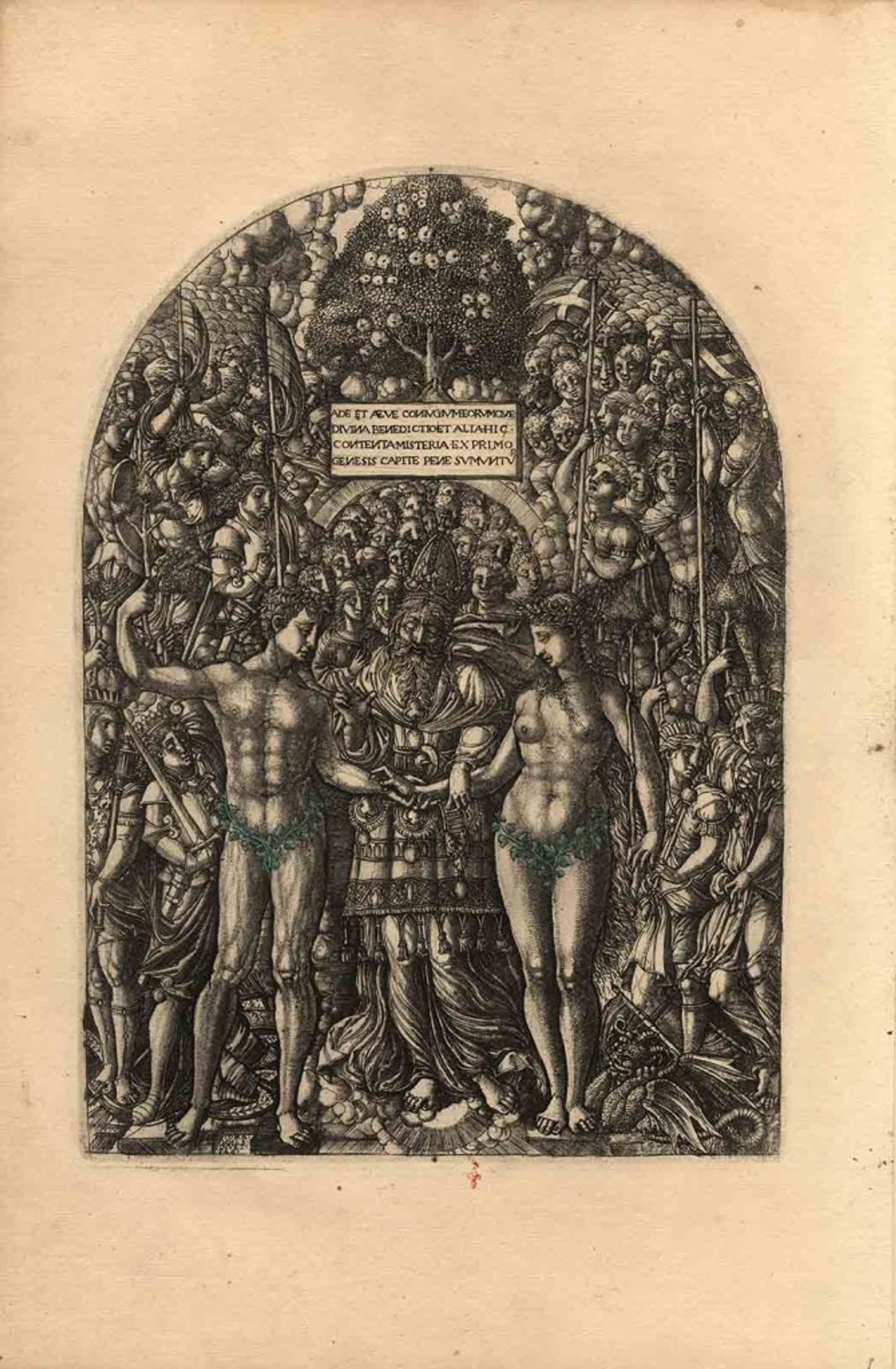 Adam et Eve reçoivent la bénédiction nuptiale de Dieu. Autour d'eux les armées célestes avec leurs étendards et le démon couché aux pieds d'Eve qui annonce la tentation future.