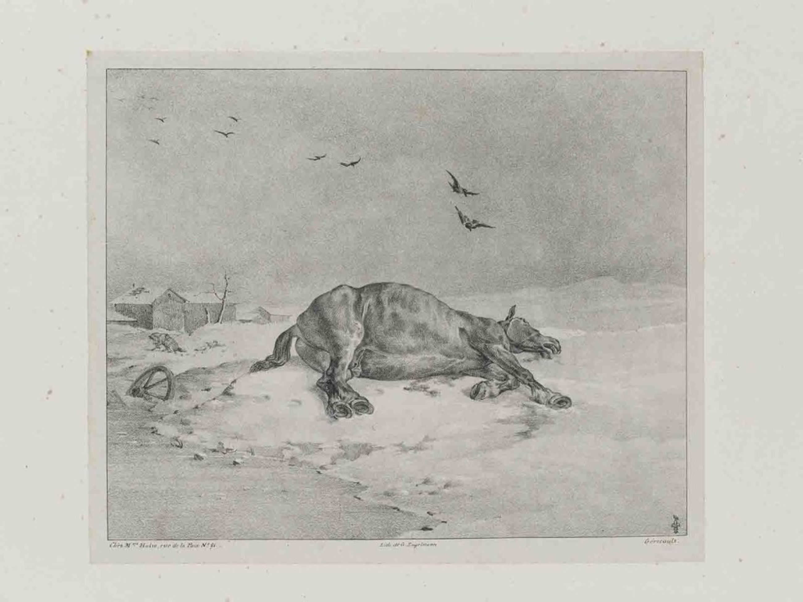 Fait partie d’une suite de cinq lithographies publiées chez Mme Hulin en 1823. Le musee des Beaux-Arts de Besançon conserve trois dessins sur le thème du cheval mort (inv. D 2155 et D 2159 et D 2129).