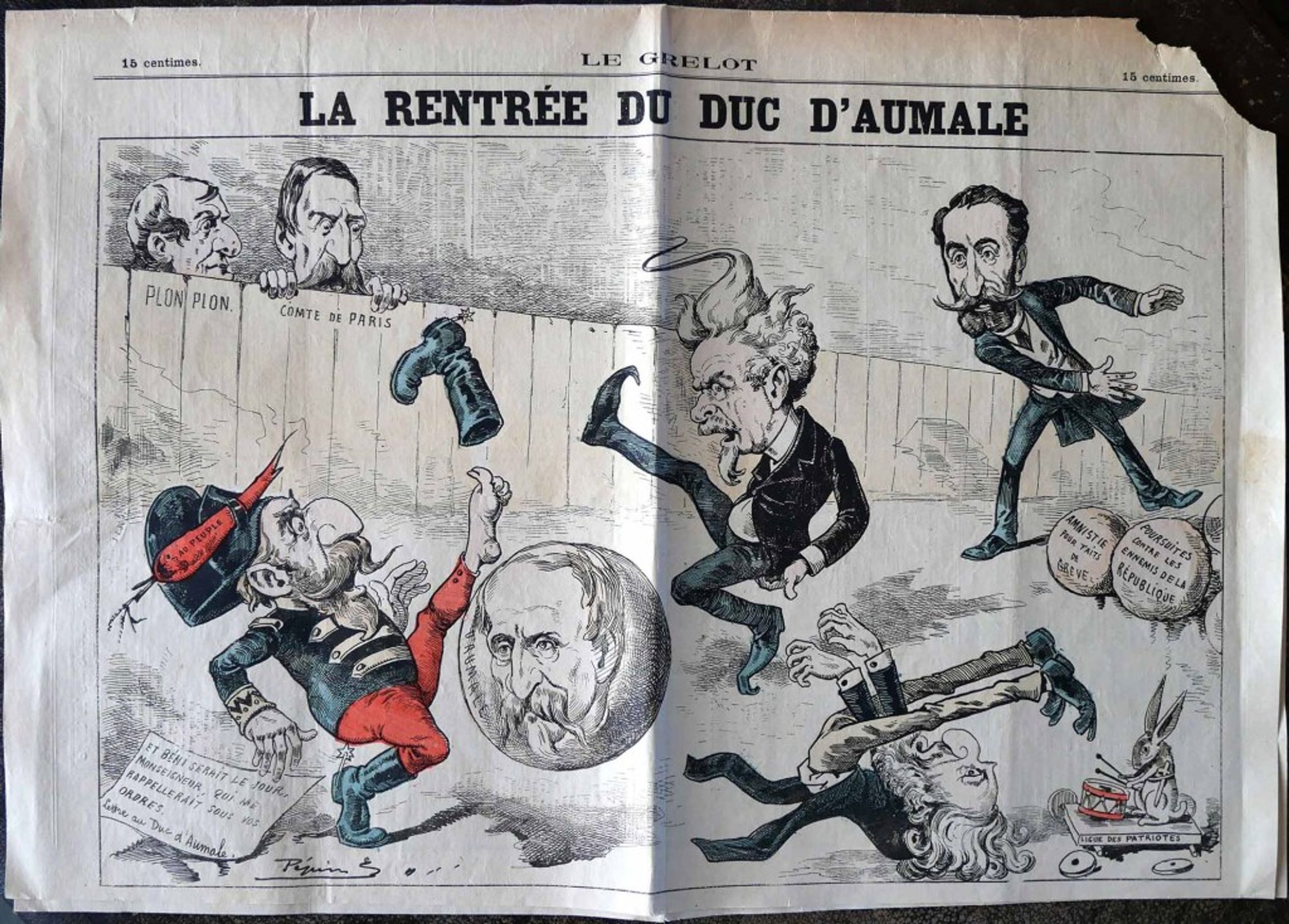 Cette gravure satirique présente plusieurs hommes politiques jouant avec un ballon portant le visage et le nom du duc d’Aumale, tandis que le comte de Paris et le prince Napoléon passent la tête au-dessus d’une palissade. Cette grande caricature est incluse en page 3 du journal Le Grelot du 17 mars 1889, n° 936, composé de 4 pages, qui inclut en page 1 une Lettre du duc d’Aumale au Président Carnot.