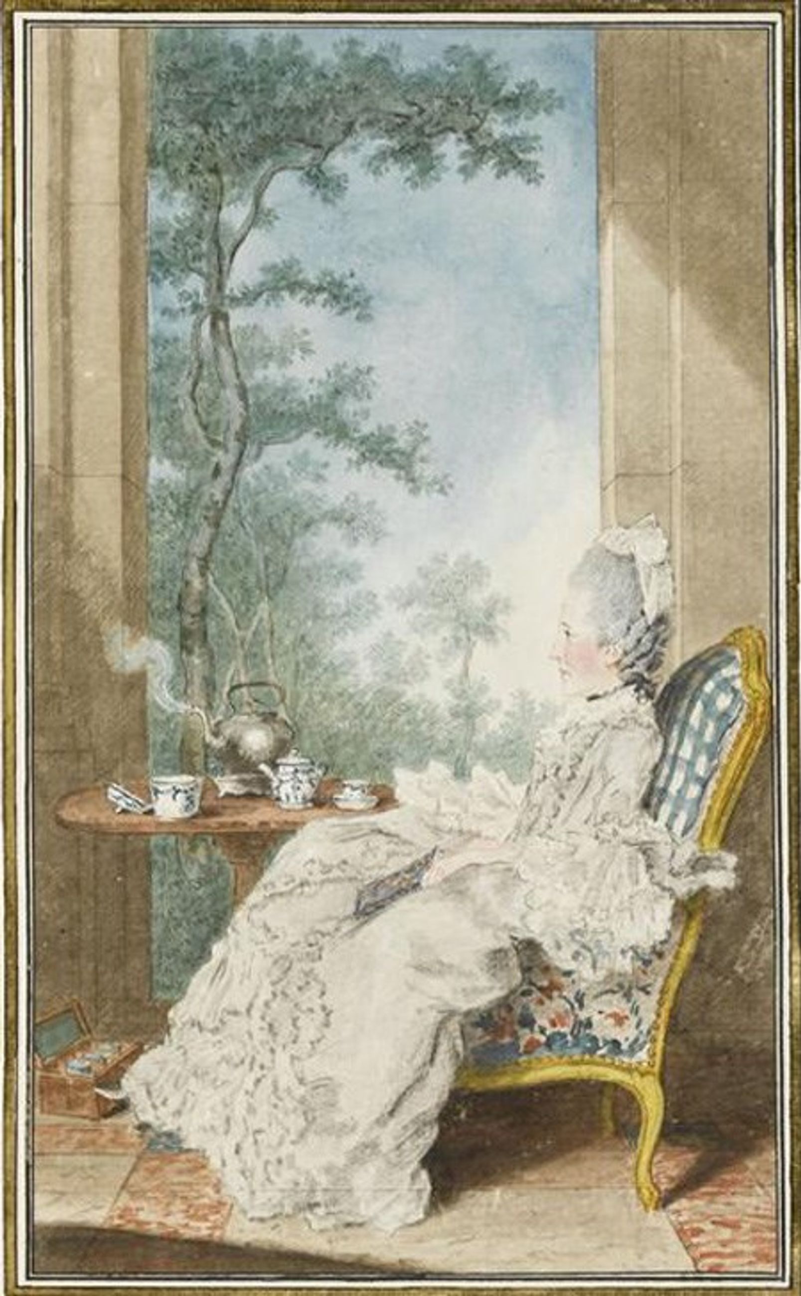 Dame de compagnie de feue la duchesse d’Orléans, Marie Charlotte Hippolyte Saujon avait épousé le comte de Boufflers-Rouverel, qui s'était distingué à la bataille de Lawfeld (1747) comme colonel-lieutenant du régiment de Chartres-Infanterie ; il mourut en 1764. Sur un autre portrait de Carmontelle (CAR-221), elle fait réciter une leçon à « Thérèse, fille d'un pauvre bourgeois de Lunéville, (…) remplie de grâces, et Mme de Boufflers se plaisait à l'élever » (Grimm, Correspondance, nov. 1763). « Amie intime de M. le prince de Conti (1717-1776), elle a sur lui le plus grand ascendant. On l’appelle l’idole du salon du Temple et de L’Isle-Adam », écrit Mme de Genlis. Auteur de drames et de comédies qui ne furent pas imprimées, la comtesse prend ici le thé dans une porcelaine de Chine, de Saint-Cloud ou de Chantilly dont le coffret est à ses pieds. Le dossier de son siège est protégé de la poudre de sa coiffure par une toile à carreaux.