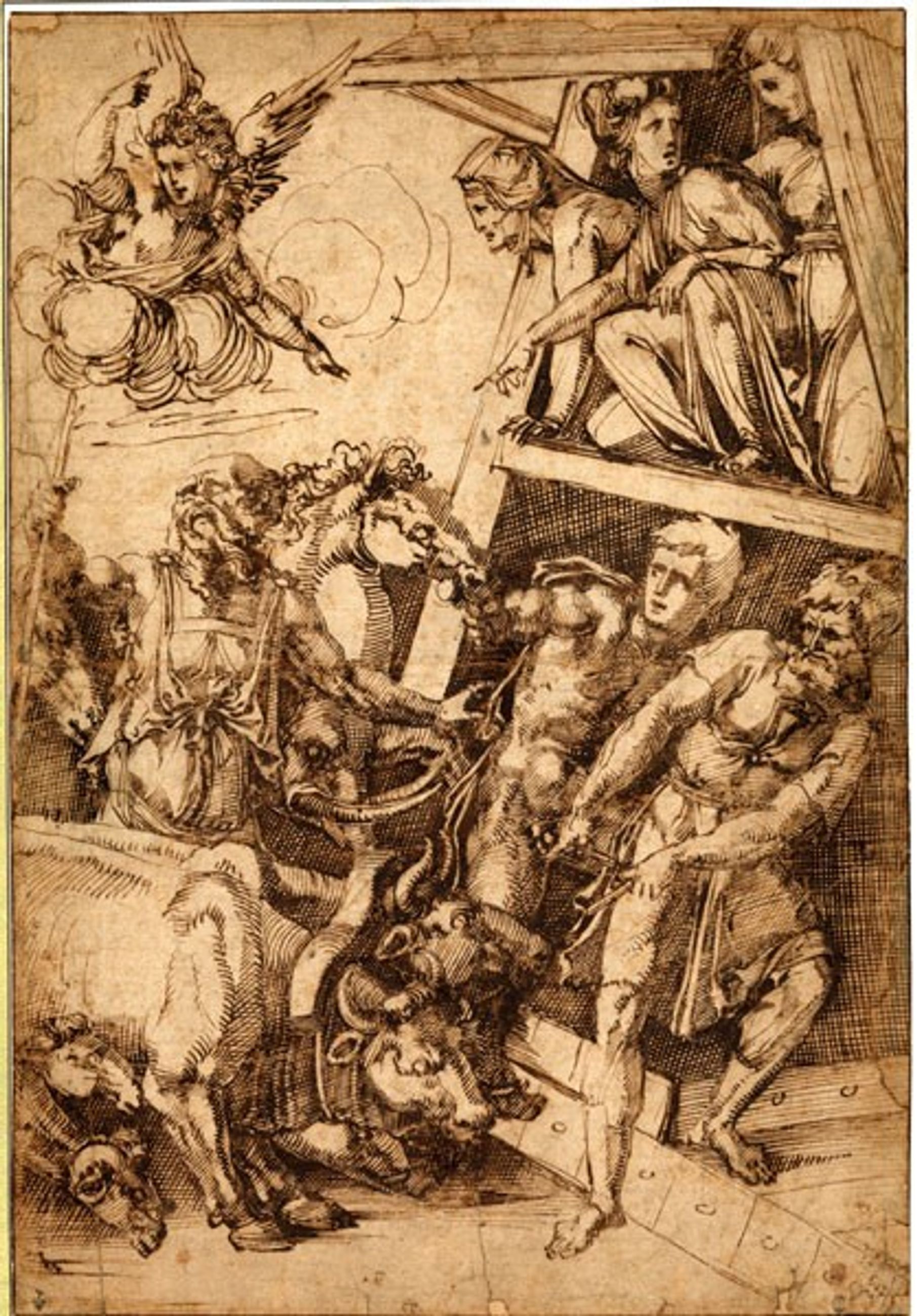 Le sculpteur florentin Bandinelli travaille beaucoup au dôme de Florence et se voit confier la direction de l’oeuvre du Duomo de Florence pour lequel il est chargé de la balustrade du choeur en 1547, terminée après sa mort par son élève Giovanni Bandini. Ce dessin appartient à la suite de scènes de l’Ancien Testament destinées à orner les bas-reliefs de bronze du choeur du Duomo de Florence, commencés en 1547, mais qui ne furent jamais exécutés.
