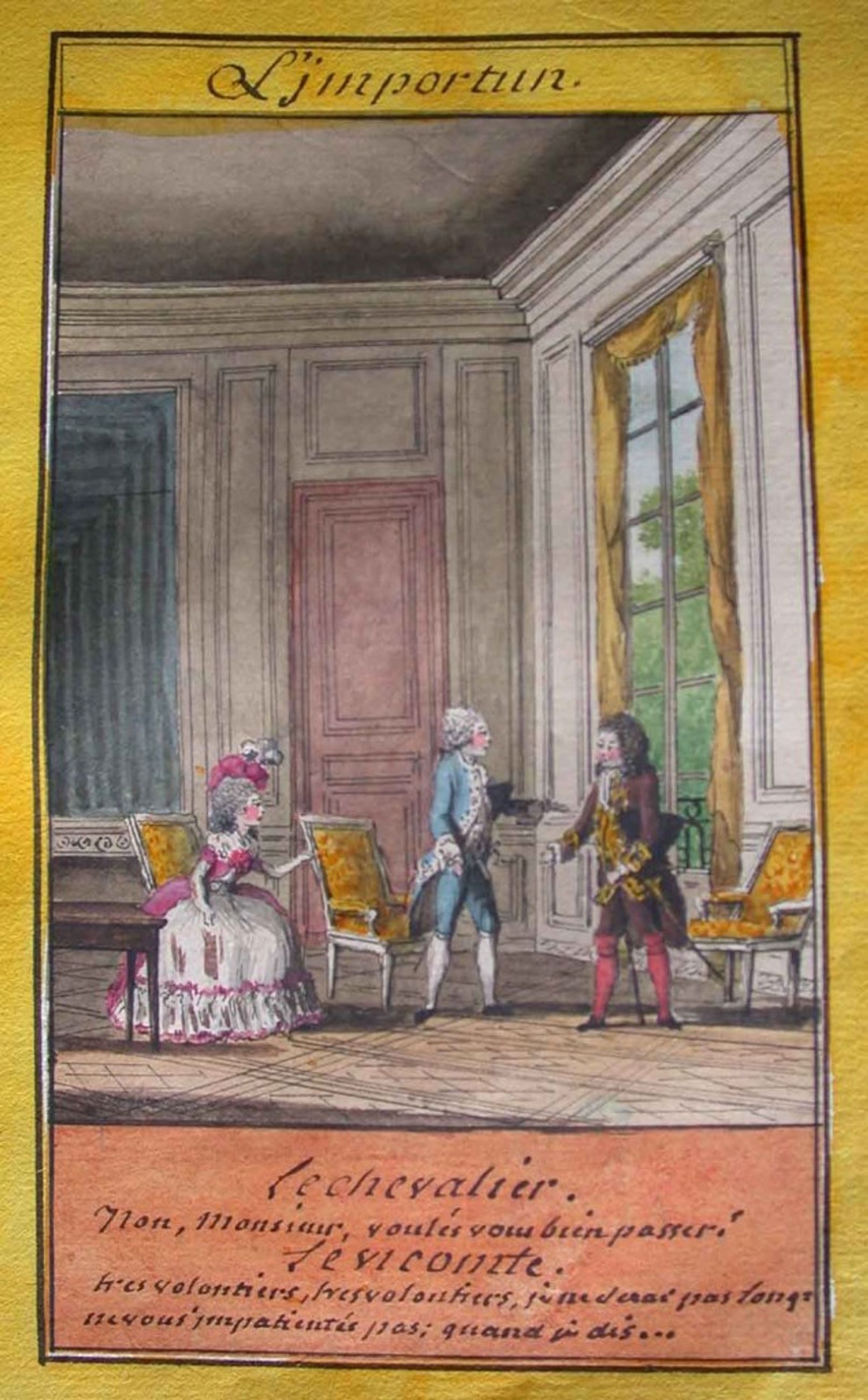 L'importun - Almanach de 1758 ; Proverbes dramatiques Recueil factice de 103 dessins illustrant le premier tome des Proverbes dramatiques - Recueil d'aquarelle pour "Proverbes" de Carmontelle