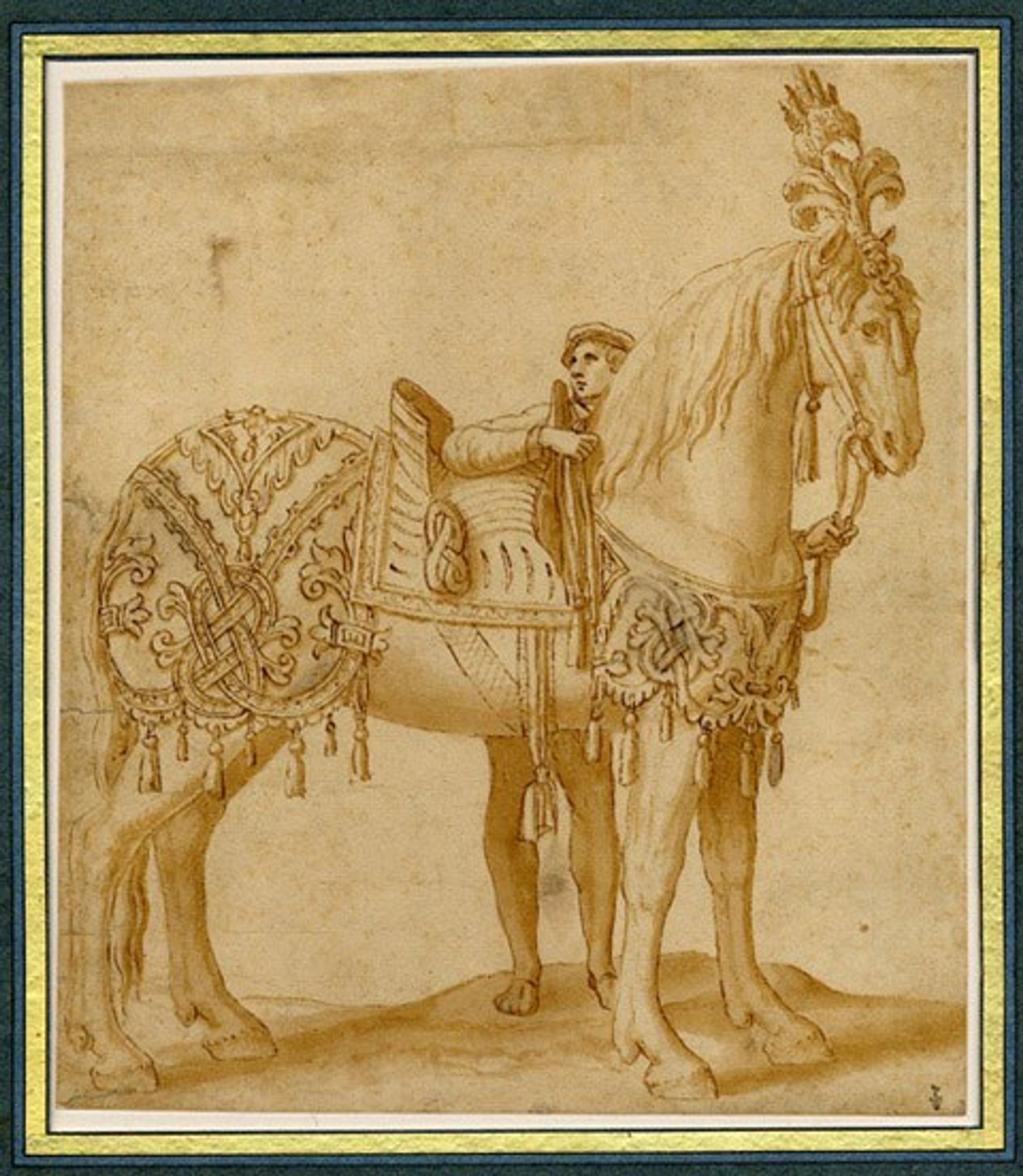 Etude de costume et de caparaçon de parade pour un cavalier et sa monture pour ce dessin ainsi que le dessin DE 159.