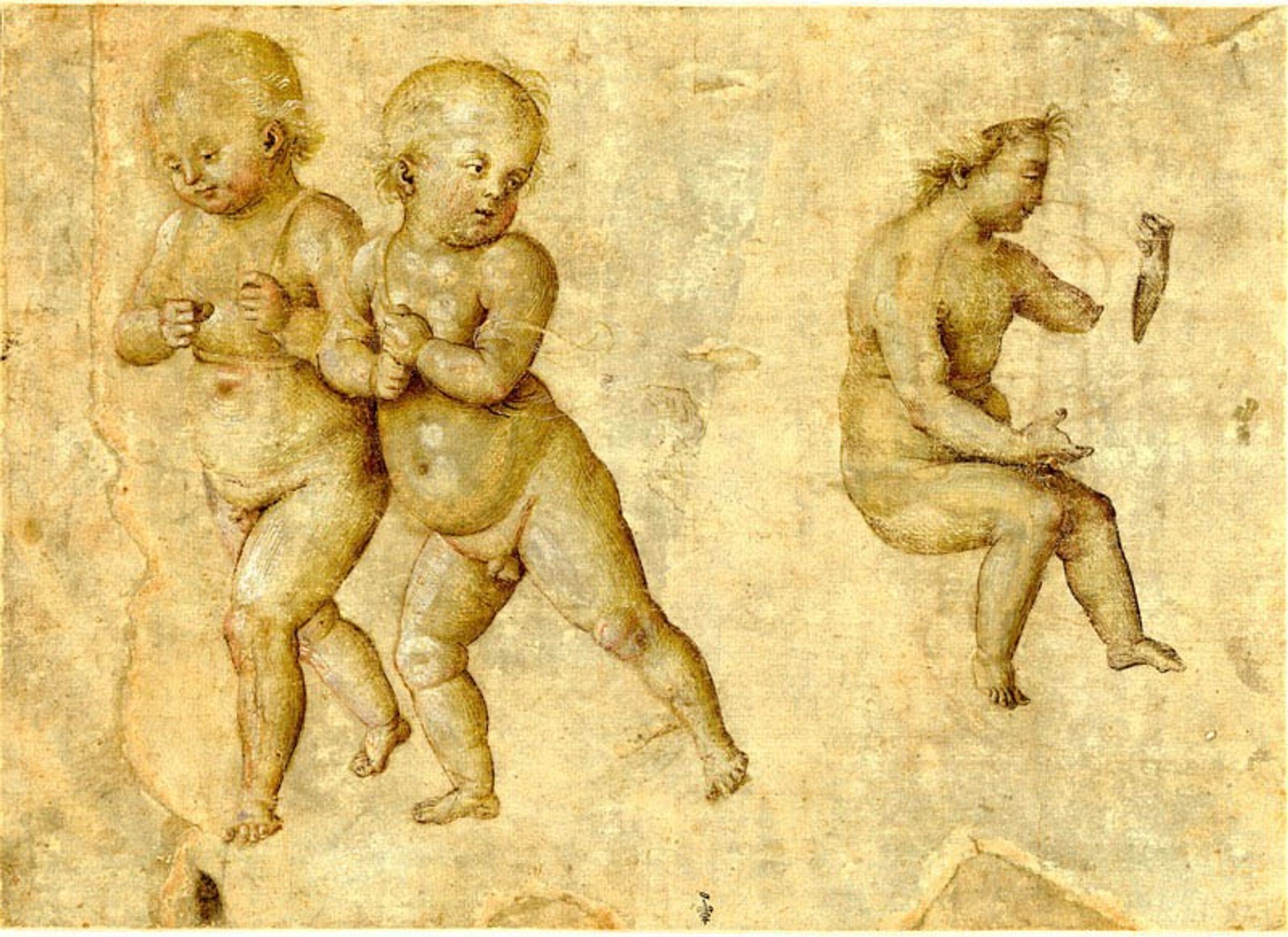 Pinturicchio quitta Pérouse en 1481 pour Rome où il collabora au chantier de la chapelle Sixtine aux côtés du Pérugin, son compatriote, avant de travailler à la Libreria Piccolomini, sise en la cathédrale de Sienne, avec l’aide du jeune Raphaël. Son style orné et sa verve narrative firent de lui un artiste recherché de l’aristocratie pontificale à Rome et notamment du pape lui-même (il peignit à fresque les appartements d’Alexandre Borgia au Vatican entre 1492 et 1494). C’est justement à cette période romaine que peut se rattacher la présente feuille. Deux putti ou enfants dodus semblent y tenir les rênes d’un char absent sur lequel serait assis un troisième. On a, à juste titre, remarqué que leurs gestes et attitudes reprenaient ceux des deux jeunes filles tirant le char de la lune sur la voûte du Collegio del Cambio, peinte par le Pérugin à Pérouse. Leur type physique rappelle quant à lui les chérubins répartis autour du trône de la figure de la Rhétorique ou de la Musique dans les appartements Borgia au Vatican. Ils sont surtout très proches d’un dessin de la même main, les Quatre enfants de Pinturicchio du musée du Louvre (collection Rothschild, 777 DR/Recto), présentant une technique similaire, typique du maître, employant des rehauts de rose. Les enfants, indépendants les uns des autres, s’y adonnent également à diverses activités, parfois inspirées de sculptures antiques. Ces deux dessins devaient être destinés à un projet décoratif imaginé par le maître à Rome. L’usure et l’état de conservation moins satisfaisant de la feuille de Chantilly où plusieurs éléments sont laissés en réserve ne doivent pas empêcher d’y voir le même artiste que sur celle du Louvre.