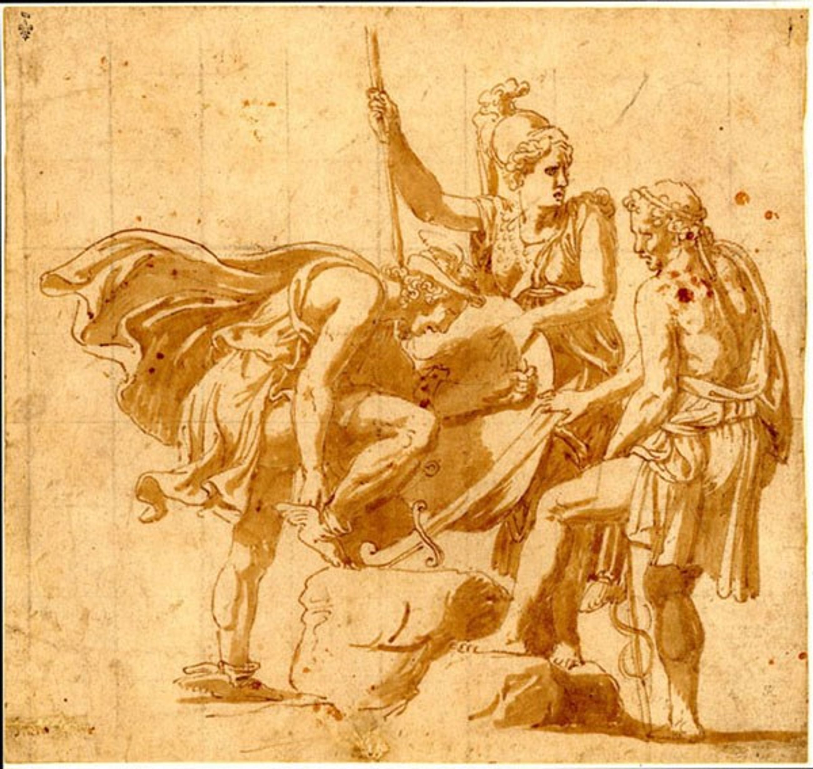 Ce dessin mis aux carreaux représente le jeune Persée chaussant des sandales ailées et recevant un bouclier des mains de Minerve, ainsi que l'épée incurvée, cadeau d'Hermès, qui lui permettront de vaincre Méduse la terrible Gorgone.