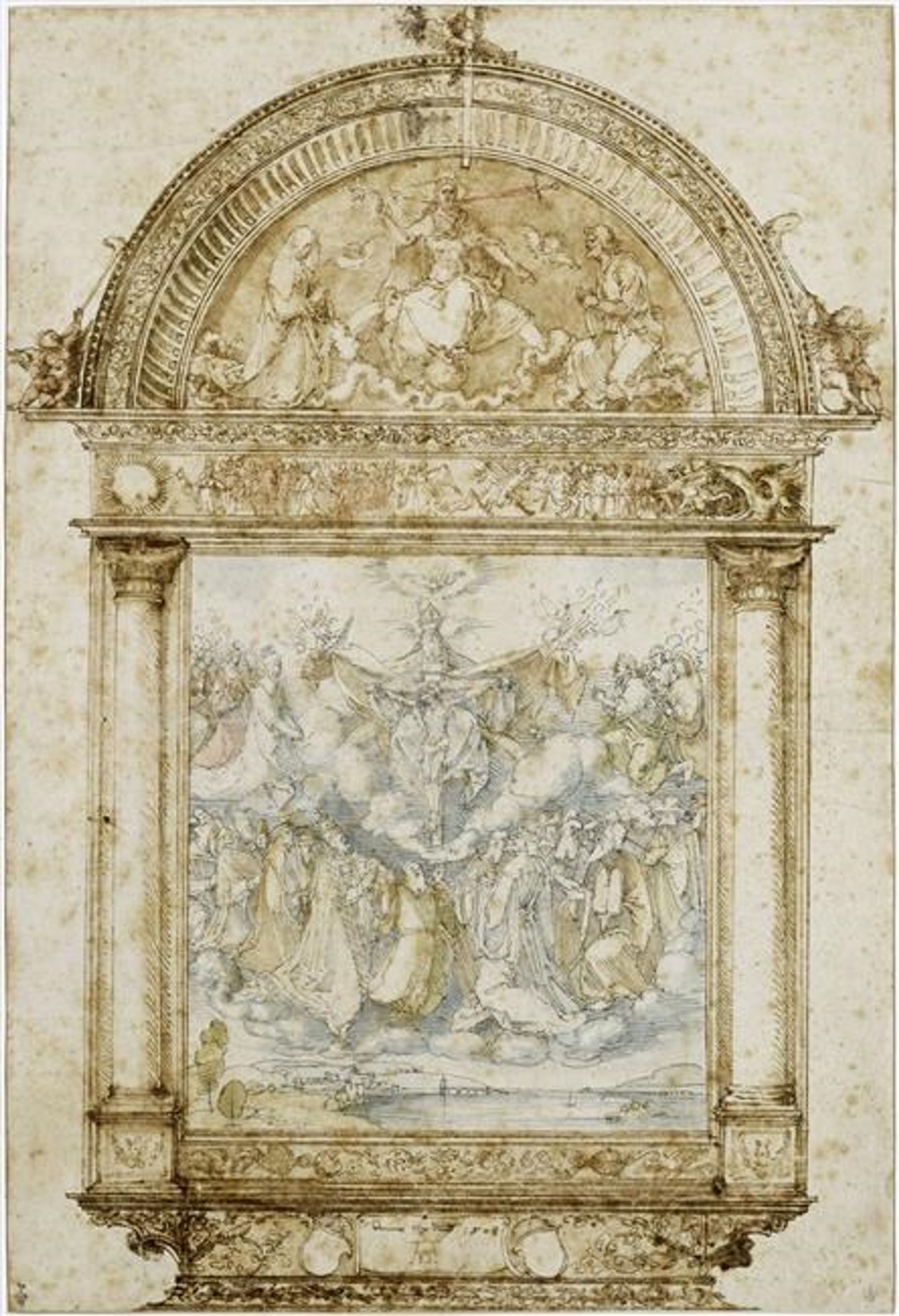 Ce dessin est le seul projet de composition connu pour l'une des plus grandes oeuvres de Dürer : le retable Landauer conservé au Kunsthistoriches Museum de Vienne inv 838 ; il s'agit vraisemblablement de l'esquisse proposée au commanditaire avant l'exécution