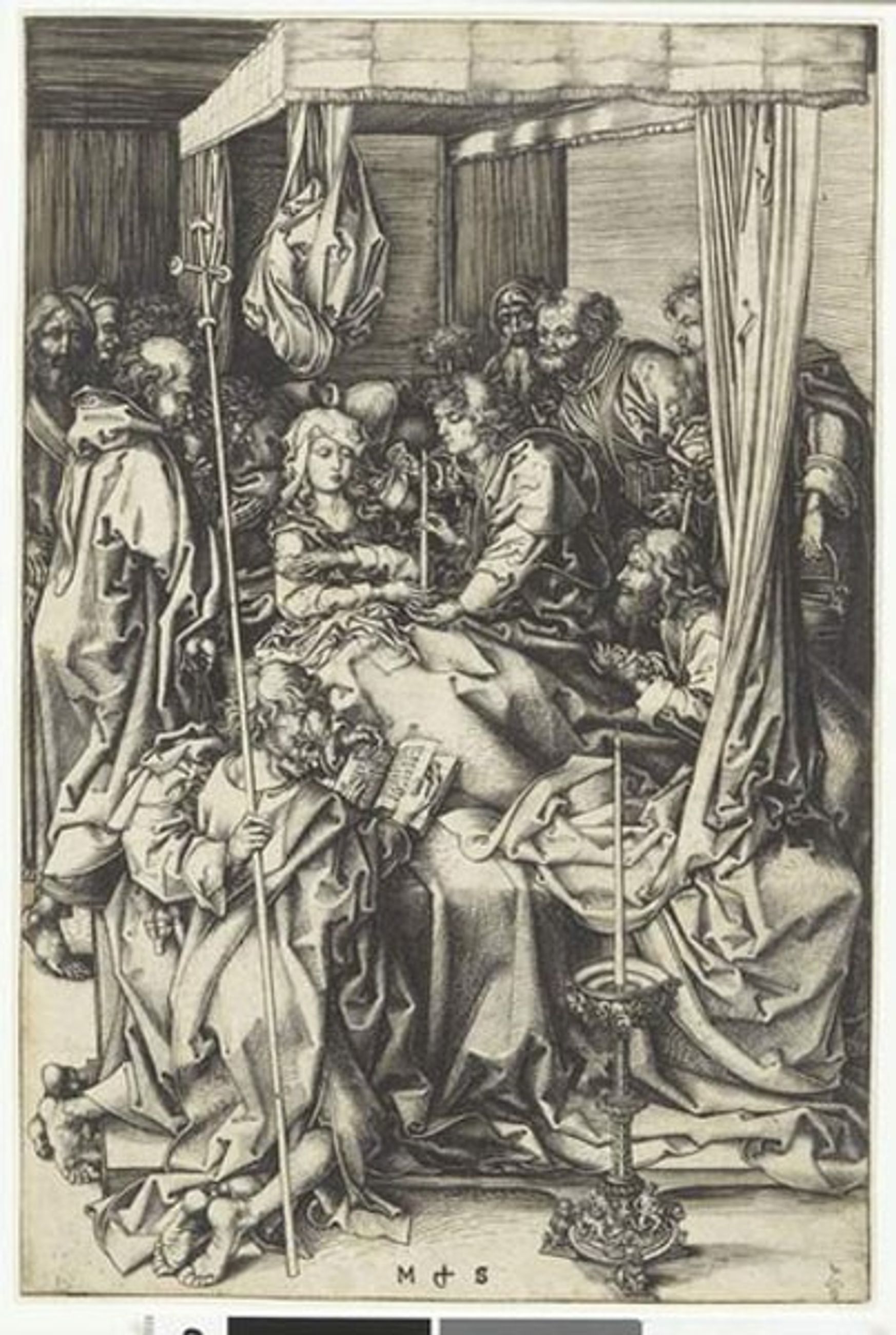 Saint Jean l'Evangéliste lui met entre les mains un cirge allumé qui, selon la croyance, avait le pouvoir de porlonger la vie des mourants. Au pied du lit, deux apôtres lisent des prières; un autre, en haut à droite, apport l'eau bénite. Le décor, traité de façon réaliste, est devenu celui d'une chambre à coucher bourgeoise de la fin du XVe siècle avec son grand lit à courtines. Le soin apporté au dessin du candélabre a souvent été considéré comme la preuve que Schongauer avait été formé dans l'atelier de son pèer. Le pied du candélabre figure des lions écrasant des femmes et des enfants nus entre leurs pattes, symbole de sauvagerie, et un homme jouant du luth, évoquant les sens humains : ces symboles s'opposent à la lumière spirituelle du cierge.