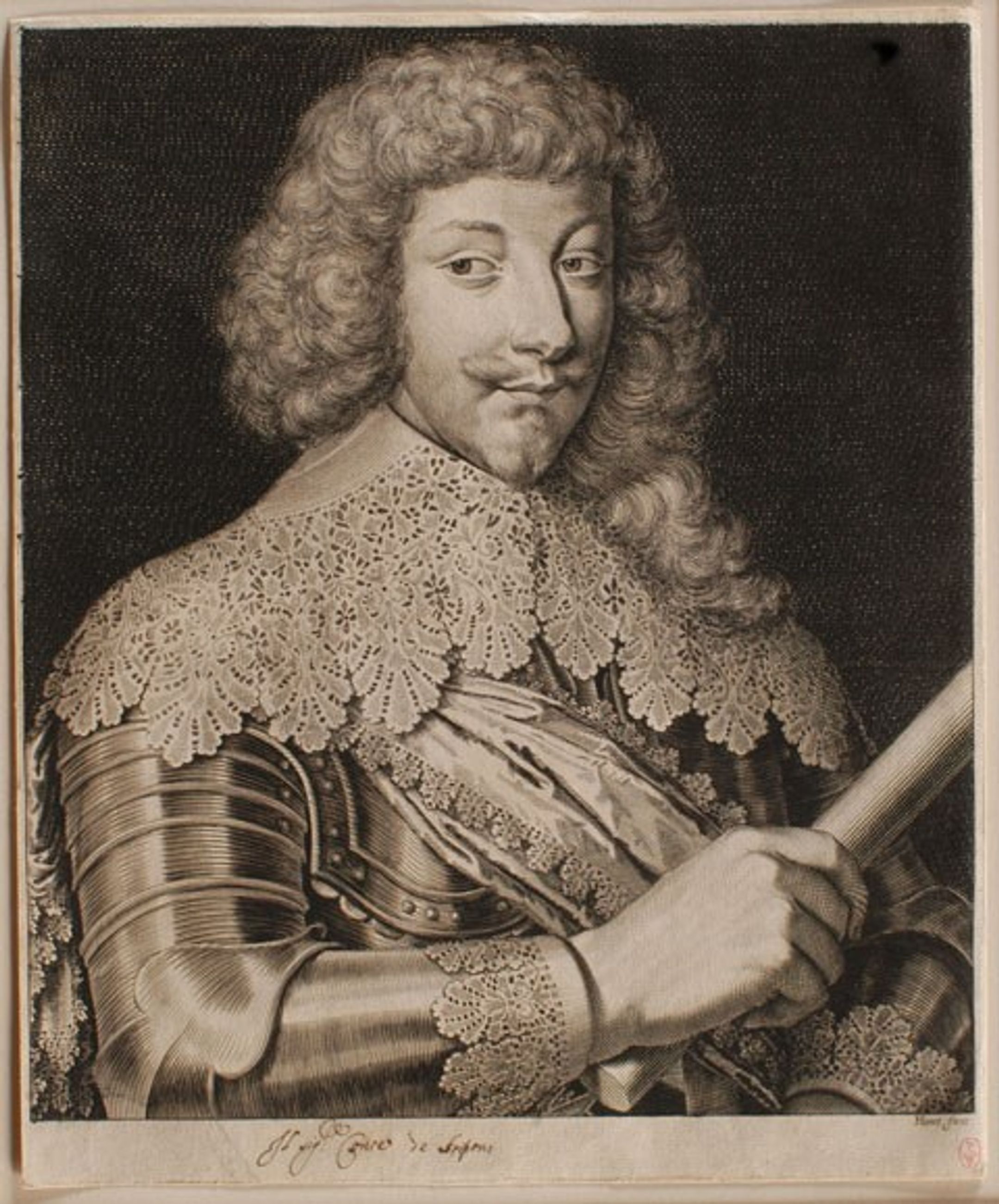 Description : Charles de Bourbon, comte de Soissons et de Dreux (Nogent-le-Rotrou, 1566-Blandy-les-Tours, 1612), en buste, cuirassé, de ¾ à droite, tenant le bâton de commandement.