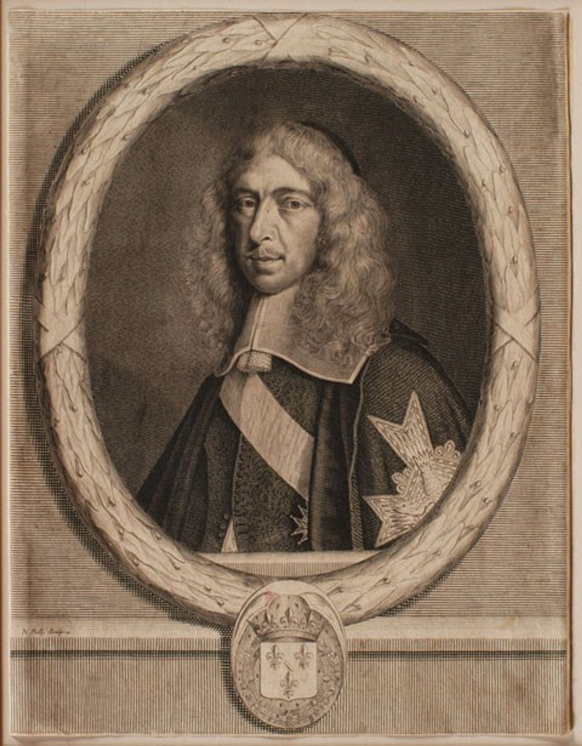 Louis de Bourbon, duc de Vendôme, duc de Mercoeur (Paris, 1612-Aix-en-Provence, 1669), cardinal (1667-1669), fils de César de Vendôme et de Françoise de Lorraine, en buste, avec le cordon et le manteau du Saint-Esprit, de ¾ à gauche, dans un encadrement ovale surmontant les armes de Condé couronnées.