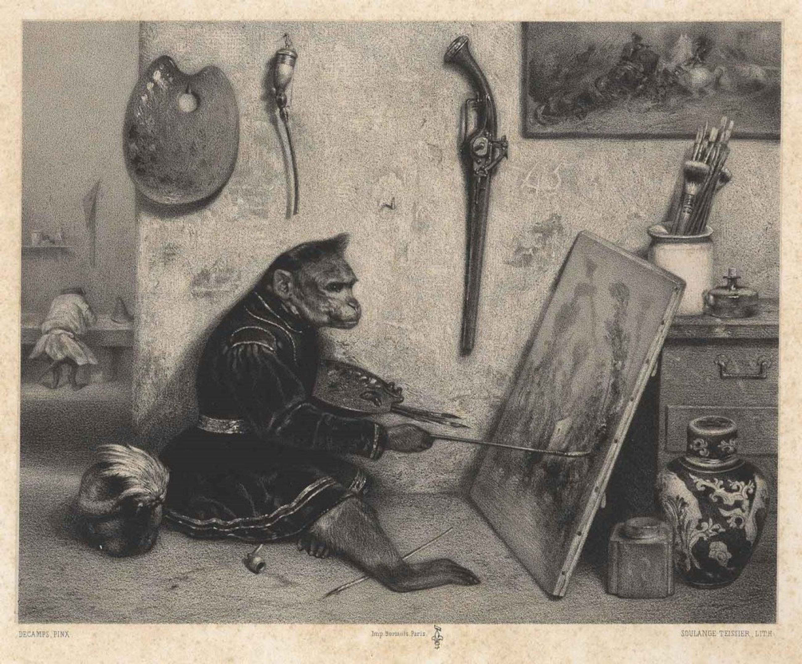 Comme dans les oeuvres de David Teniers, Chardin, ou Christophe Huet, Decamps aime mettre en scène des singes parodiant les activités des humains. Il s'agit ici d'un singe peintre, assis à même le sol, il semble très absorbé par sa toile. Au fond de l'atelier on aperçoit son assistant sans doute en train de préparer les couleurs.