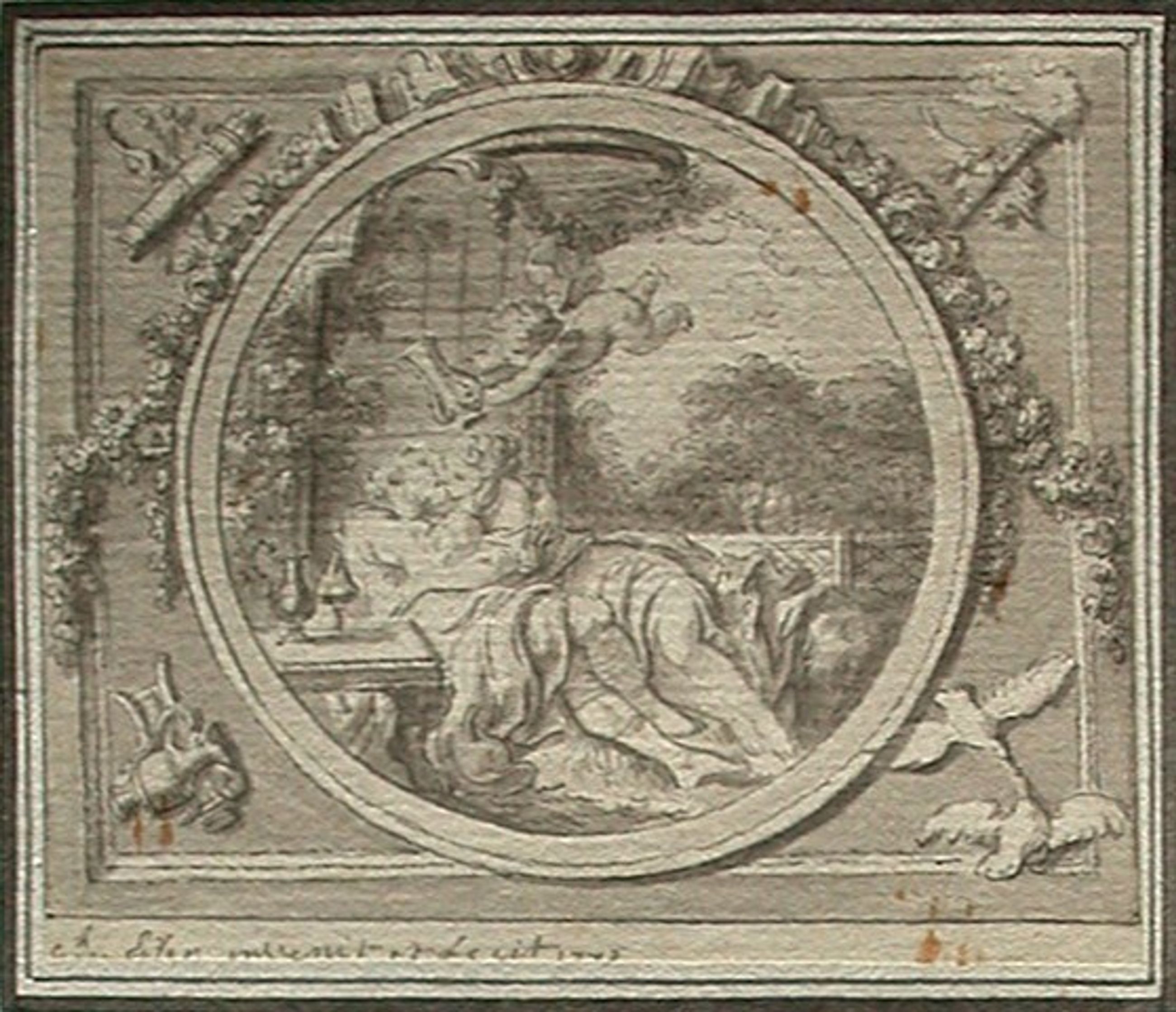 Ce dessin fait partie d'un ensemble de 28 dessins préparatoires à l'illustration de la "Vie d'Anacréon, Sapho, Bion et Moschus, Héro et Léandre". Ces dessins originaux d'Eisen sont reliés dans un ouvrage édité à Paris sous la direction de Lamy en 1782. Ouvrage conservé à la bibliothèque du château de Chantilly (cote : IX-G-041).