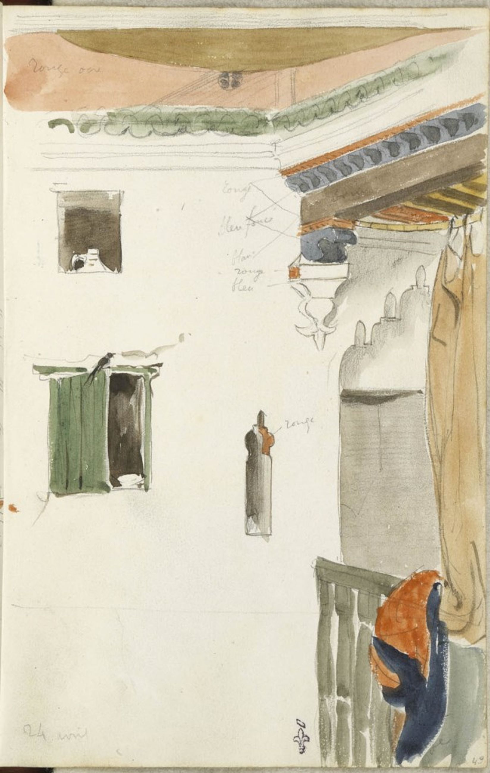 Détail d'une maison arabe, murs blancs, fenêtre à volet vert, meurtrière, galerie de bois peinte en vert avec une draperie posée dessus - Album de voyage (Espagne, Maroc, Algérie, janvier-juin 1832) - Album