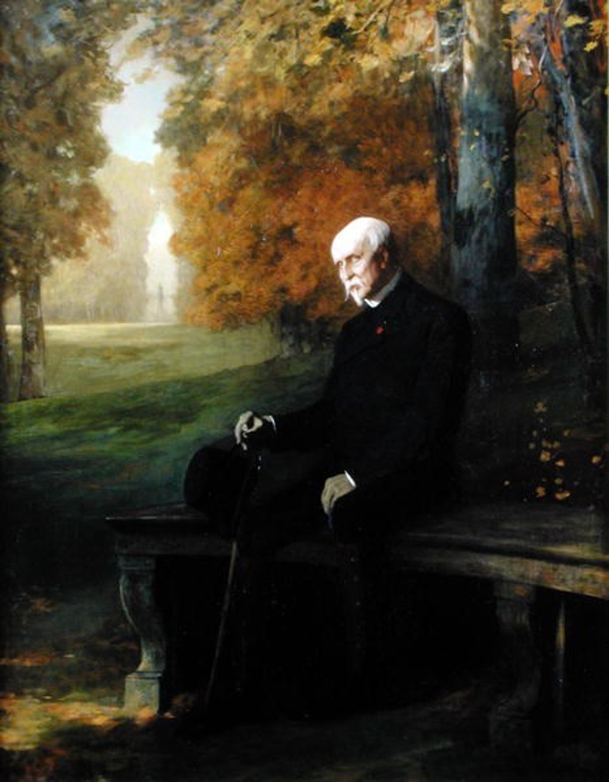 Le grand portrait du duc d’Aumale par Benjamin-Constant montre le duc en costume de chasse, portant des guêtres et une culotte de velours bleu, la rosette de la Légion d’honneur éclairant sa veste noire ; il est assis sur un banc courbe dans le parc de Chantilly et l’on devine derrière lui la statue du connétable Anne de Montmorency (1886) qu’il avait commandé à Paul Dubois. Portraitiste officiel (il fit le portrait de la reine Victoria et de la haute société anglaise), orientaliste depuis son voyage au Maroc en 1872, Benjamin-Constant devint membre de l’Institut en 1893. Il sollicita l’autorisation de faire le portrait du duc d’Aumale le 28 février 1896, ce que le duc accepta, lui proposant de poser à Chantilly. Le peintre l’imagina assis dans sa bibliothèque près du buste du Grand Condé, ou debout dans une allée du parc avec le château au fond, ou encore recevant ses invités en haut de son escalier, mais ce fut en fait assis dans le parc ; selon les critiques contemporains, à l’origine le duc se détachait sur fond de ciel bleu, l’artiste ayant modifié sa composition, ce qu’a confirmé la restauration. Les séances de pose débutèrent le 23 mars 1896, le duc se promenant sur sa jument Dorothée et donnant une « séance ambulante », se poursuivirent durant l’été et l’automne, l’artiste venant en famille à Chantilly ; interrompues le 6 décembre par la crise cardiaque dont fut victime le duc, elles reprirent en janvier 1897. Image d’automne un peu mélancolique, ce portrait a été peint quelques mois avant la mort du modèle. Exposé au Salon de 1897 lors de la disparition du modèle le 7 mai, et peu apprécié de la critique qui le jugea « déconcertant », fréquemment utilisé pour la nécrologie du prince, mais désormais avec beaucoup plus d’éloges pour le peintre, il a été gravé par Charles Waltner (Inv.Na 210 et 211). Resté dans la famille d’Orléans, il était conservé roulé en très mauvais état et a fait l’objet d’une restauration, également grâce aux Amis du Musée Condé.