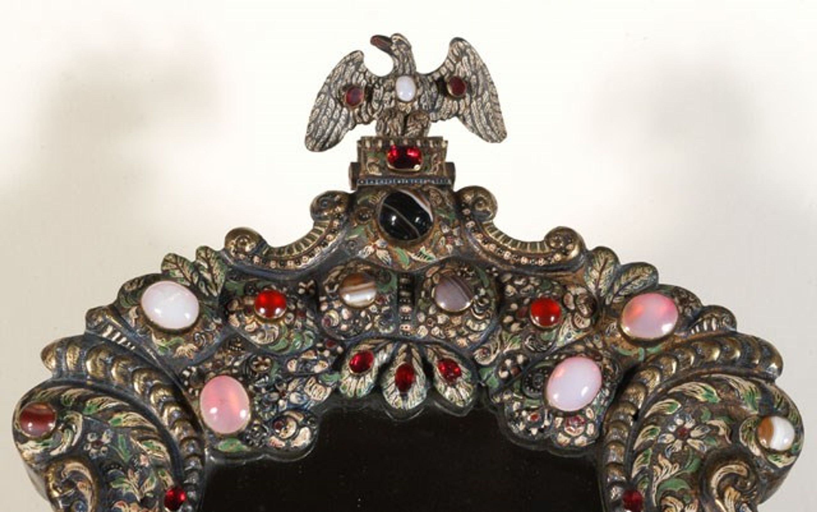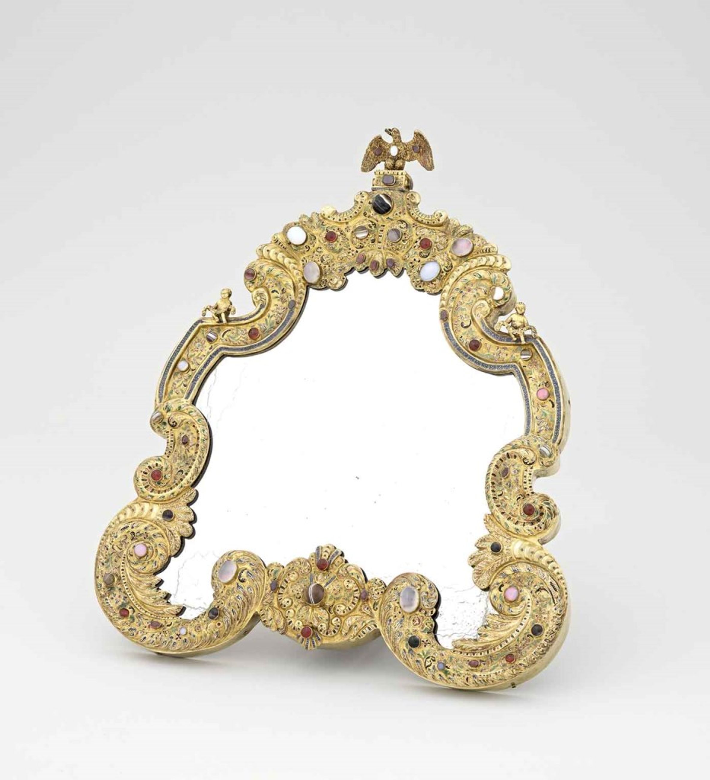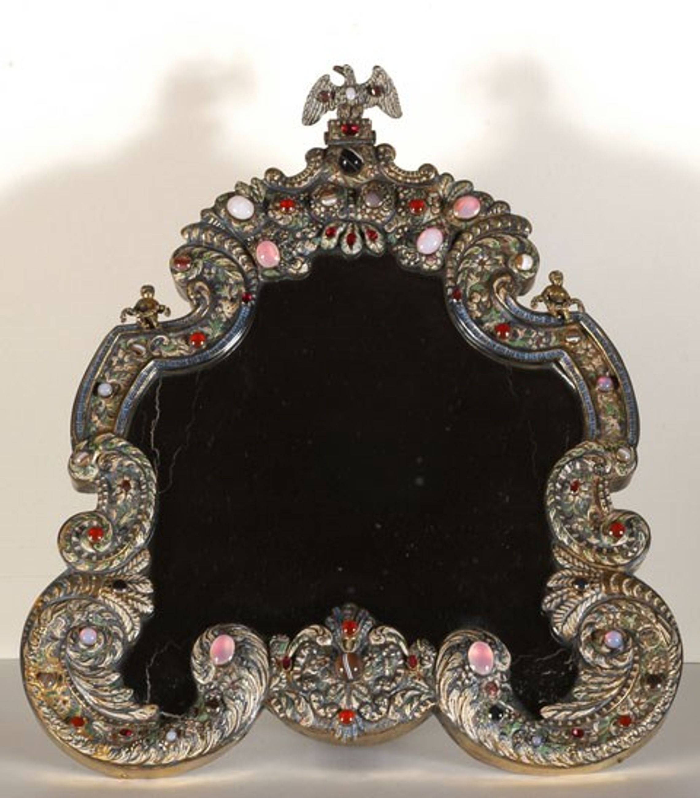 Miroir sur pied de forme chantournée, avec son chevalet, en métal repoussé avec pierres semi-précieuses, surmonté d’un aigle - Toilette de la reine de Hongrie - Miroir