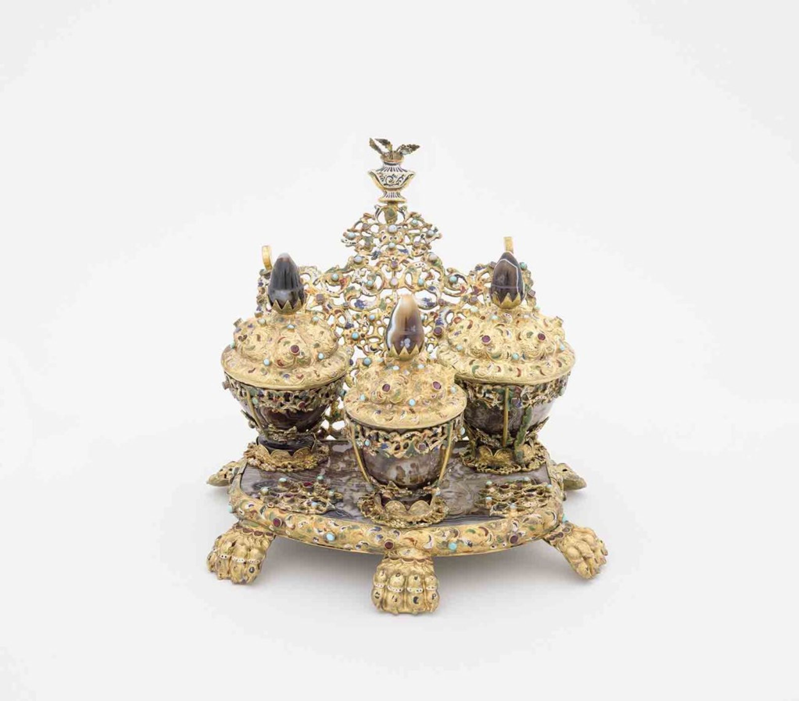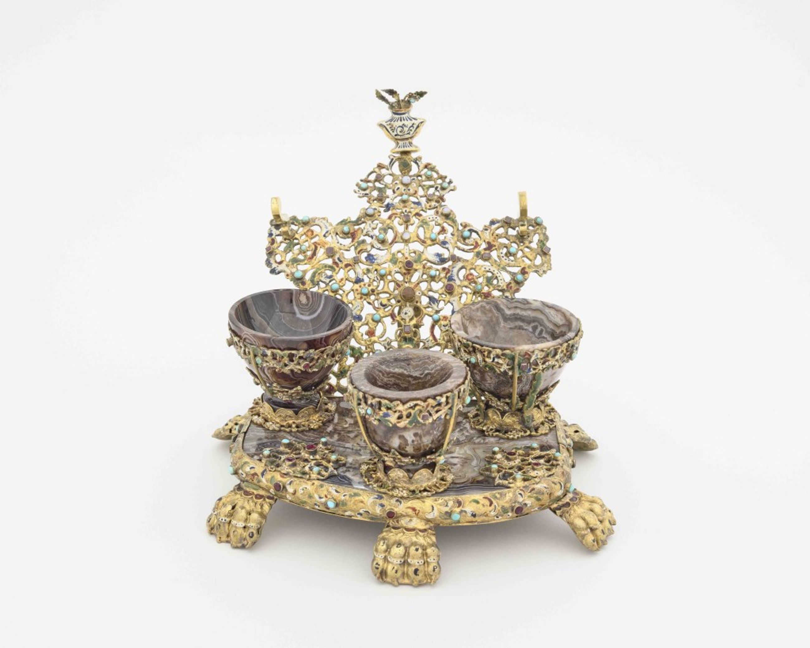 Ecritoire composé d’un plateau en marbre reposant sur six pieds en forme de pattes de lion enrichi de 28 pierres précieuses, dosseret où sont incrustées 45 pierres fines, surmonté d’un vase avec une fleur dont le pistil est une pierre fine et de trois feuilles. Sur ce plateau trois petites coupes de marbre dont une mobile, sur supports en métal ar - Nécessaire de toilette dit à tort (?) de l’impératrice Marie-Thérèse, (1717-1780), reine de Hongrie (1741-1780), mère de l’empereur Joseph II et de la reine Marie-Antoinette, XIXe siècle ?