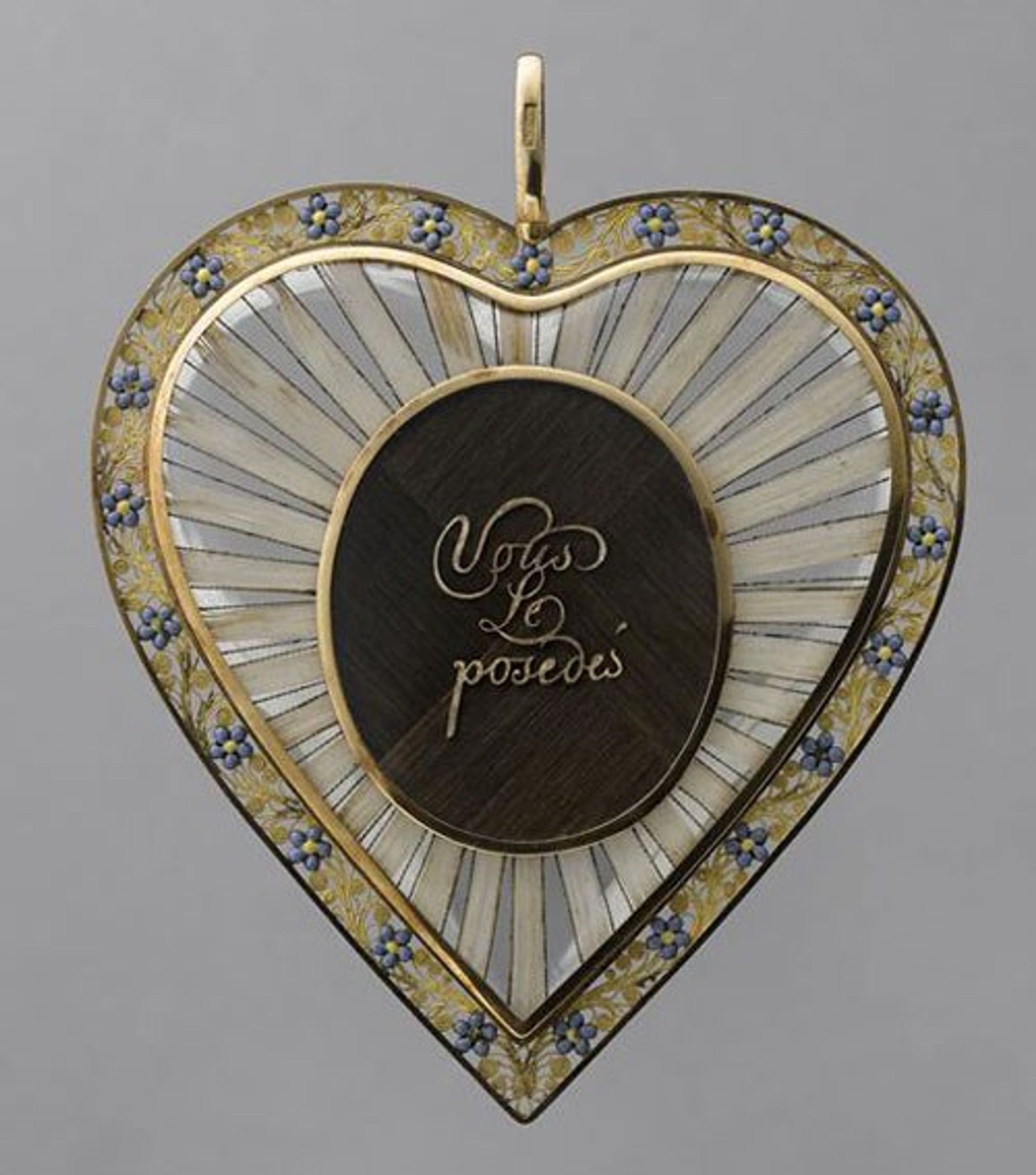 Succession de la reine Marie-Amélie ; inventaire de Twickenham (1853-1872) n° 166 p. 35 (comme La reine Marie-Amélie jeune, médaillon forme coeur, cheveux)