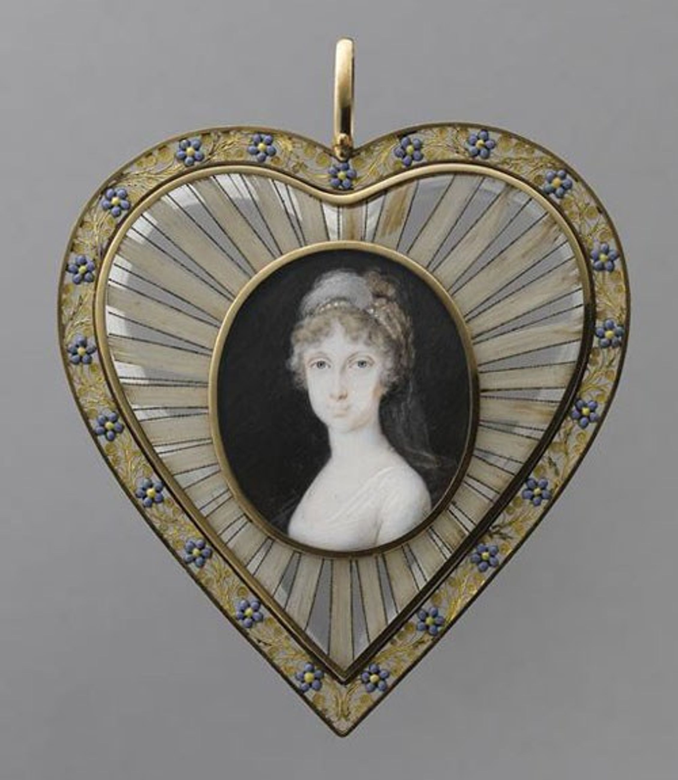 miniature sur ivoire encadrée dans un grand coeur de cristal à bordure d'or et d'émail, cheveux disposés en rayon autour du portrait. Fleurs bleues et palmettes