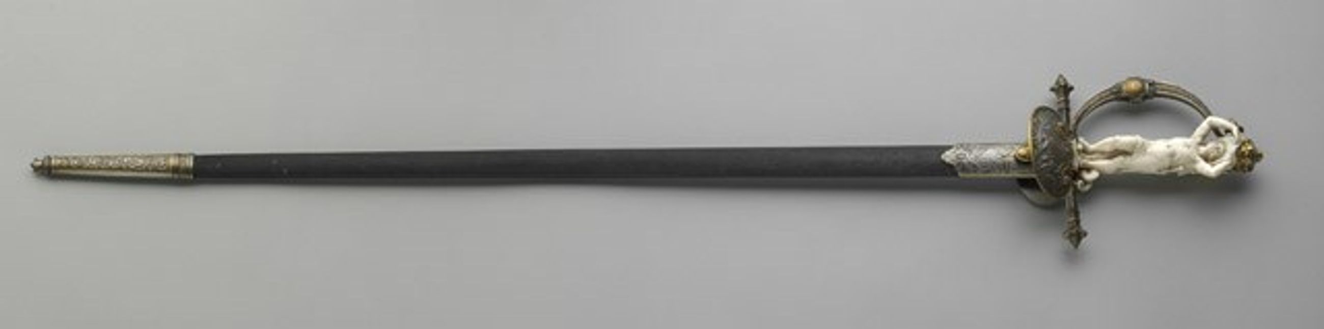 La poignée de l'épée fut dessinée par Honoré Daumet. La sculpture sur ivoire exécutée par Chapu et Chaplain et l'orfèvrerie ciselée par Froment-Meurice en 1888. Sur le pommeau est représenté un guerrier casqué vêtu d'une cotte collante. La structure est en fer, les détails en or et argent damasquinés par Chesnau. Sur la coquille est ciselé un trophée composé d'armes orientales et de manuscrits dont l'un porte la légende HISTOIRE DES PRINCES DE CONDE, ouvrage écrit par le duc d'Aumale durant son exil en Angleterre. Le bas-relief a été modelé par Chaplain et exécuté par Tasset. Les armes d'Orléans figurent avec la devise du duc d'Aumale J'ATTENDRAI, et l'inscription latine GALLIA MEMOR.
