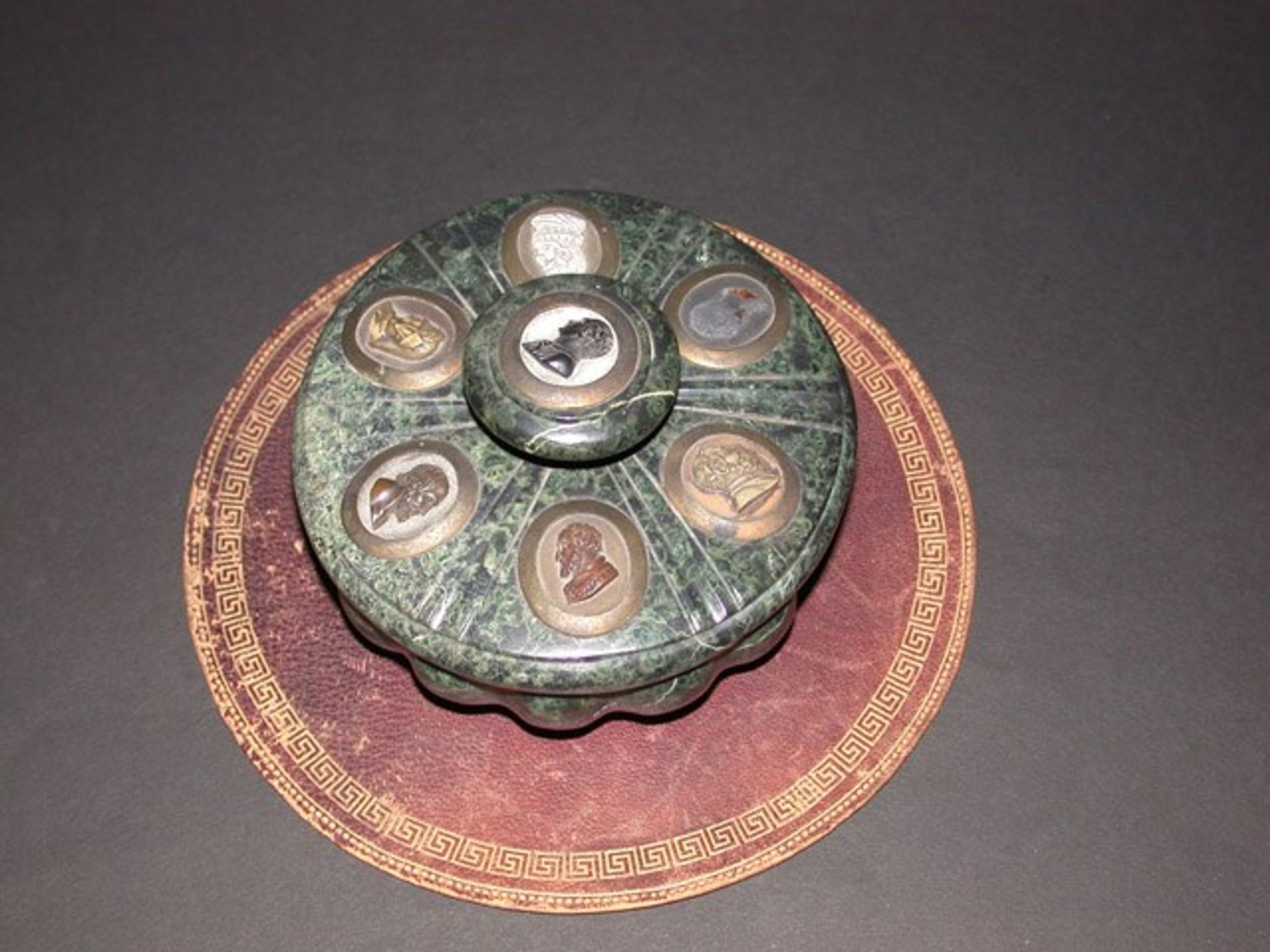 Encrier en marbre vert et son couvercle orné de 7 médaillons (1 manquant) représentant des personnages de profil, dont Dante