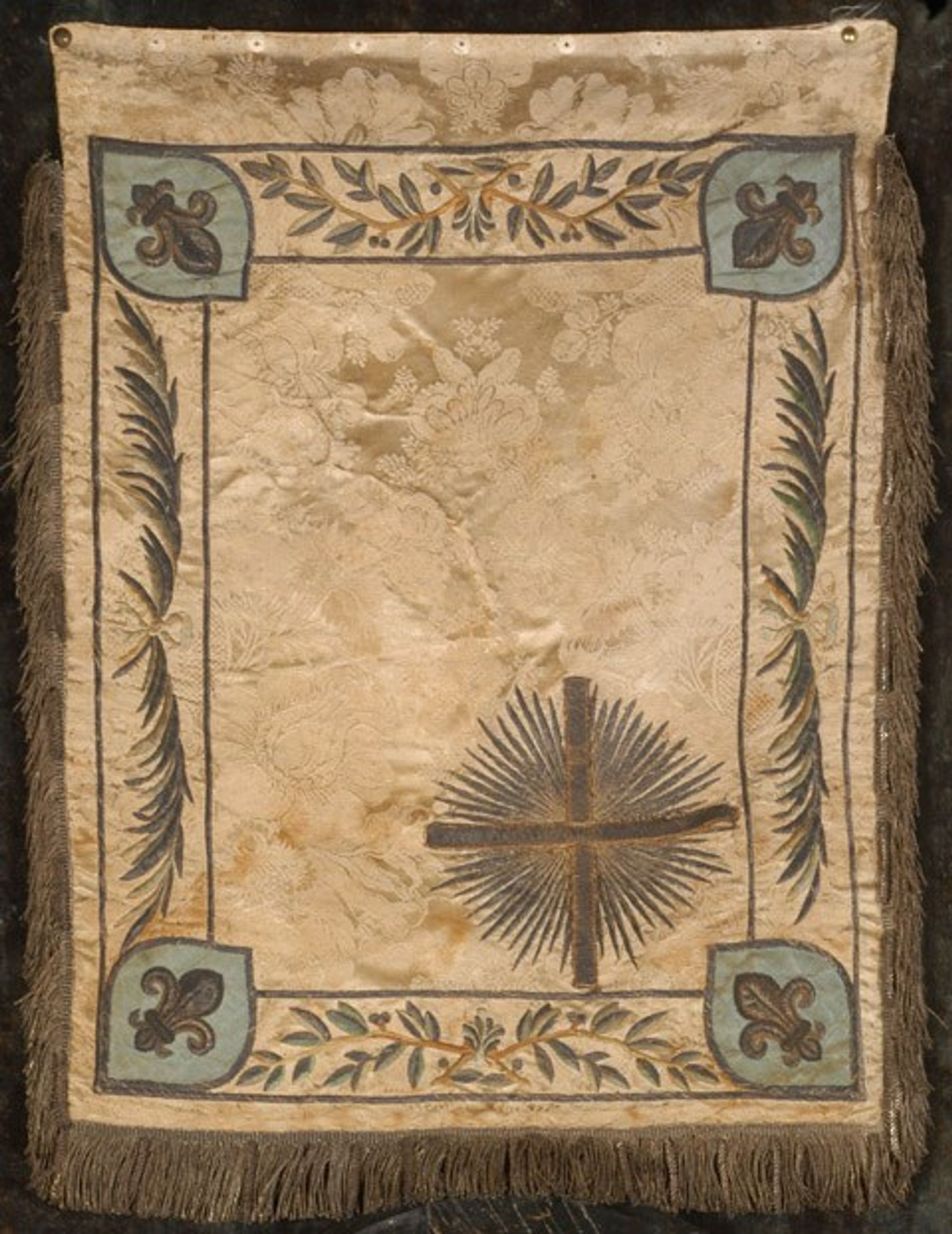 Fait partie d'un ensemble de trois guidons de cavalerie du régiment noble à cheval du duc de Berry, dont deux avec leur hampe, à fond crème, portant aux 4 angles une fleur de lys sur fond d'azur (1797-1801) (cf. aigles décousus exposés dans la vitrine de la Salle des Gardes : ils ont été décousus en 1800-1801 lors du licenciement de l’armée)