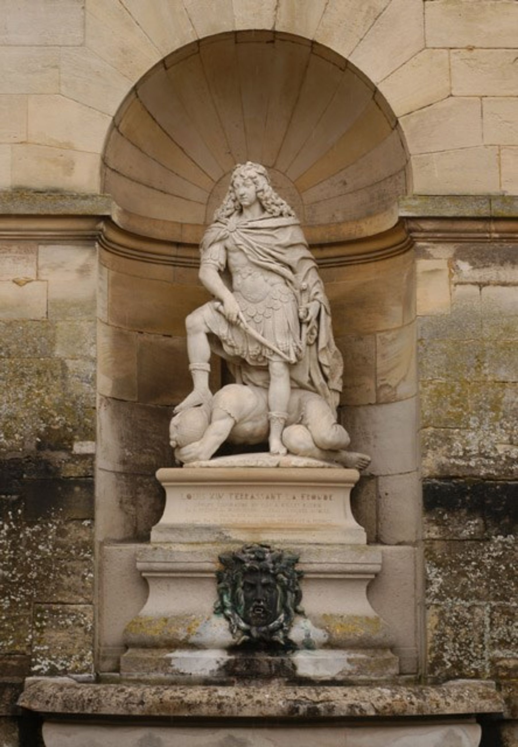 Chantilly ; Parc du château ; inv. 1897, p. 11 ; Cour de la Capitainerie, 1998 ; Inventaire de Chantilly en 1846, fo 18, n° 1 (statue marbre blanc Louis XIV terrassant la Fronde, origine : Palais-Bourbon 350 ; Chantilly, immeuble (placée dans une niche au château))