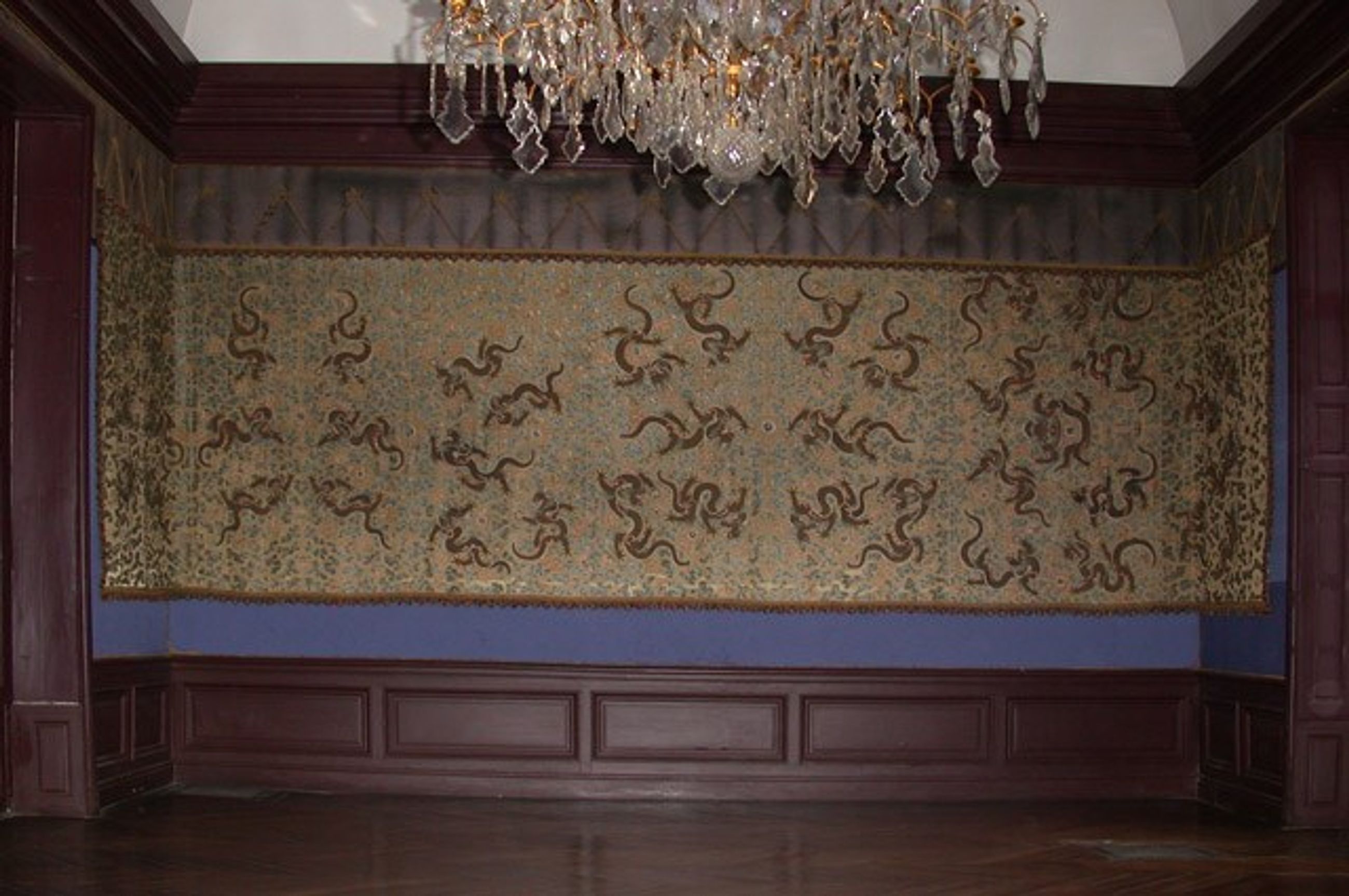 Cette tenture chinoise en soie jaune est brodée de quarante et un dragons sur plus de 8 m de long. Véritable chef-d’œuvre, cette tenture réputée provenir du palais d’été de Pékin était aussi nommée « lit impérial ». Les dragons à cinq griffes, saisis en plein mouvement, gueule ouverte, confirment une provenance impériale. Ils se détachent sur des nuages stylisés, affectant à la fois les formes de bon augure du champignon de longévité (lingzhi) et de la tête de sceptre (ruyi). Les chauves-souris stylisées sont des symboles de bonheur et de longévité. Dans ce décor inspiré du monde rural chinois, le dragon est à la fois bénéfique et redoutable. Un élément circulaire, bordé de flammèches, constitue la « perle » avec laquelle jouent les dragons. La même technique de broderie est employée pour les costumes de cour, les « robes-dragon ».