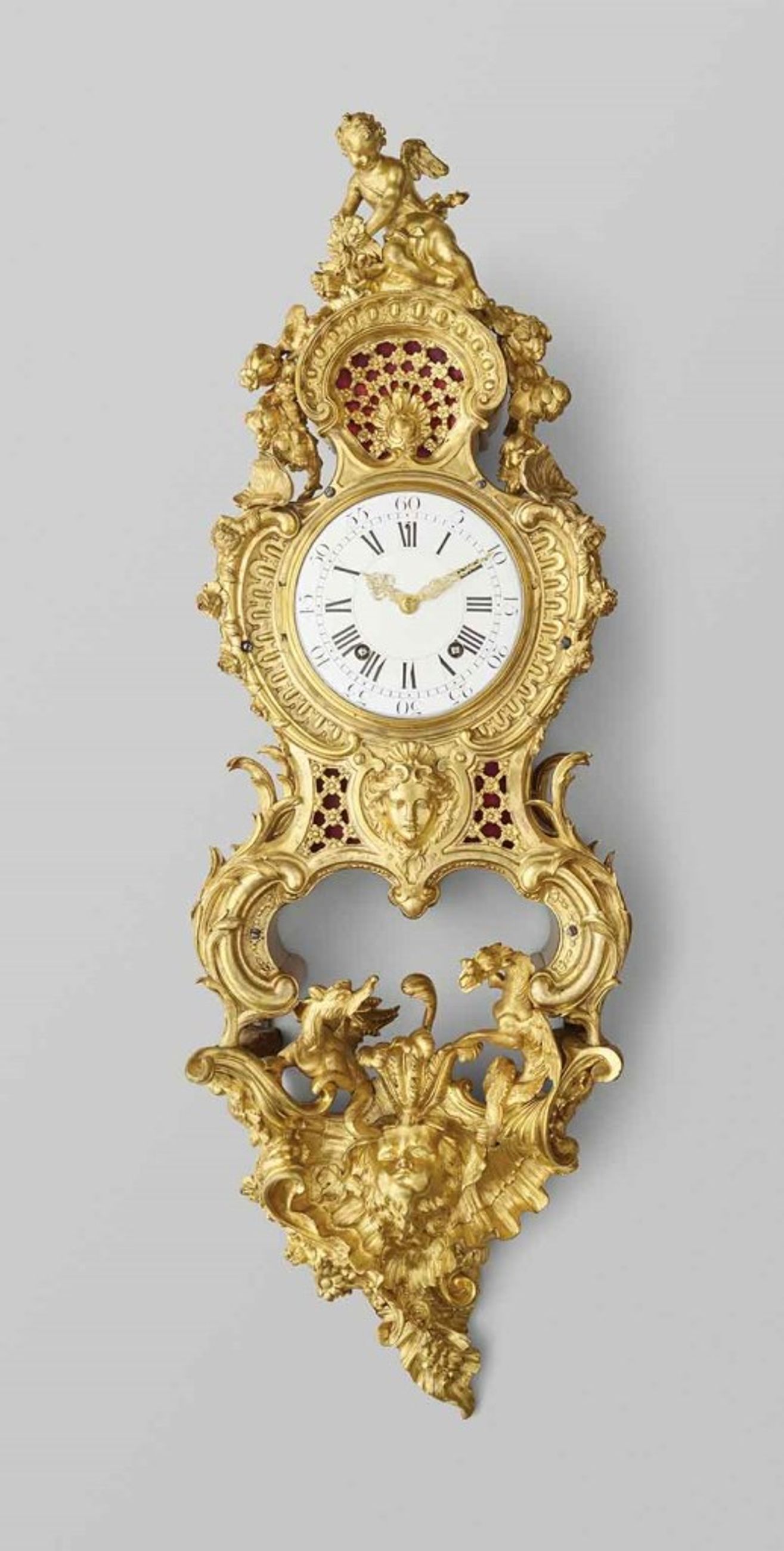 Comme l’a souligné Alexandre Pradère dans son étude consacrée à l’œuvre de l’ébéniste et sculpteur Charles Cressent , ce cartel appartient au premier modèle établi par l’artiste au tournant des années 1735. Il s’inscrit dans une série de cartels à masque de femme coiffée de coquille, dont les pieds sont enrichis de palmes et la partie cadran soulignée de chutes de fleurs. Pour ces cartels, Cressent proposa des consoles d’applique d’un rocaille exacerbé, mêlant roches, coquilles déchiquetées, encadrées de deux dragons affrontés au centre desquels surgissent tantôt une tête de lion, un coq ou encore comme dans le modèle du duc d’Aumale une tête d’enfant soufflant qui peut être identifié comme Borée, Éole ou encore Zéphyr. Cette dernière formule fut apparemment plusieurs fois fondue par Cressent, livrée par l’horloger Jean-Baptiste Baillon en 1745 pour la chambre de la Dauphine à Versailles et dans les mêmes années par Étienne Lenoir, prouvant par là même que Baillon n’en avait pas eu l’exclusivité. On la retrouve sur un autre cartel décrit dans l’inventaire après décès du fermier général parisien Marin de La Haye qui fut à plusieurs reprises un client de Cressent. Ce cartel acquit