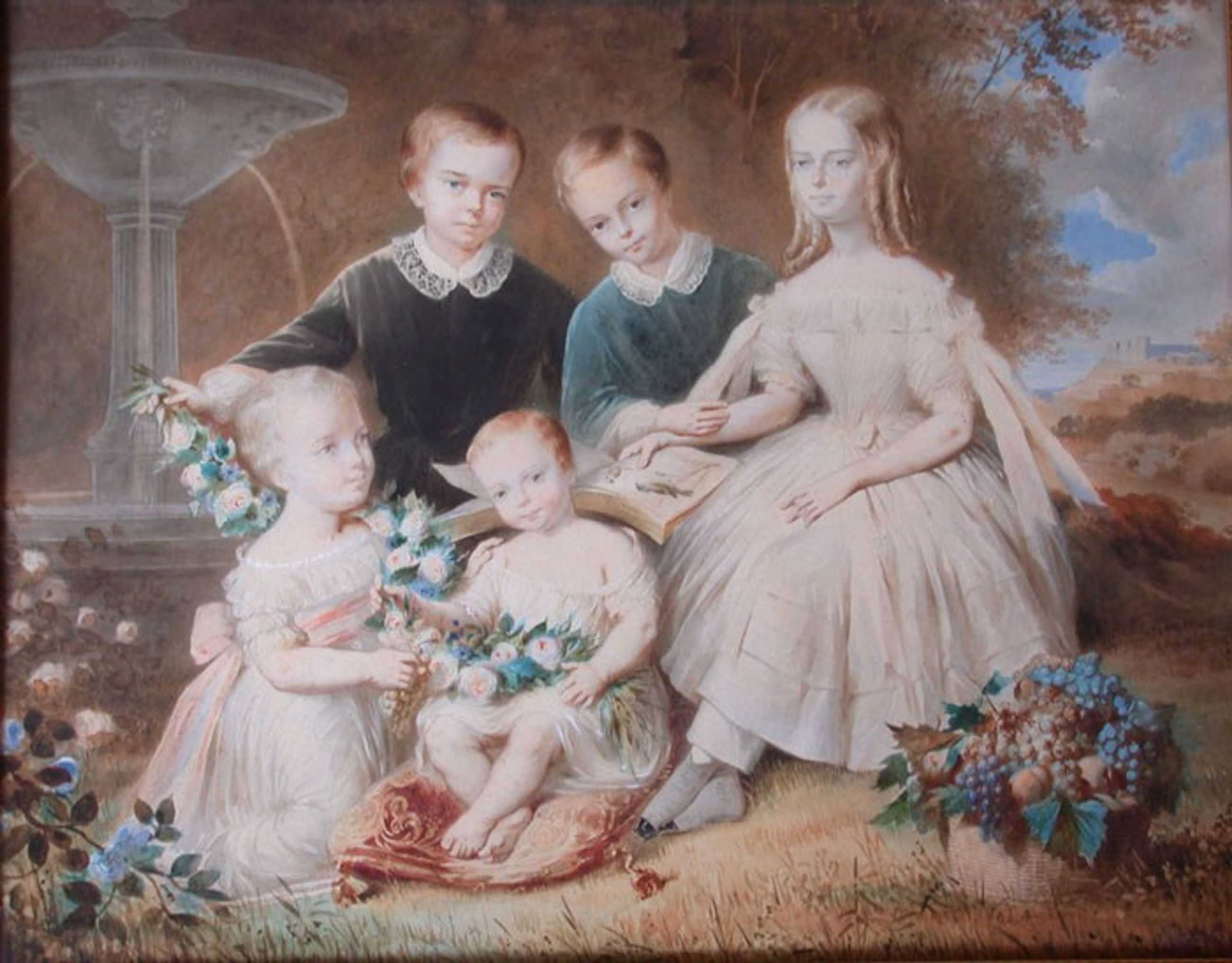 Cinq enfants dans un jardin : les enfants de la reine Adélaïde et du roi de Sardaigne Victor-Emmanuel II : la princesse Clotilde, le prince de Piémont Umberto Ier(1844- ?), le duc d’Aoste (roi Amédée d’Espagne), le duc de Montferrat, la reine Maria-Pia de Portugal.
