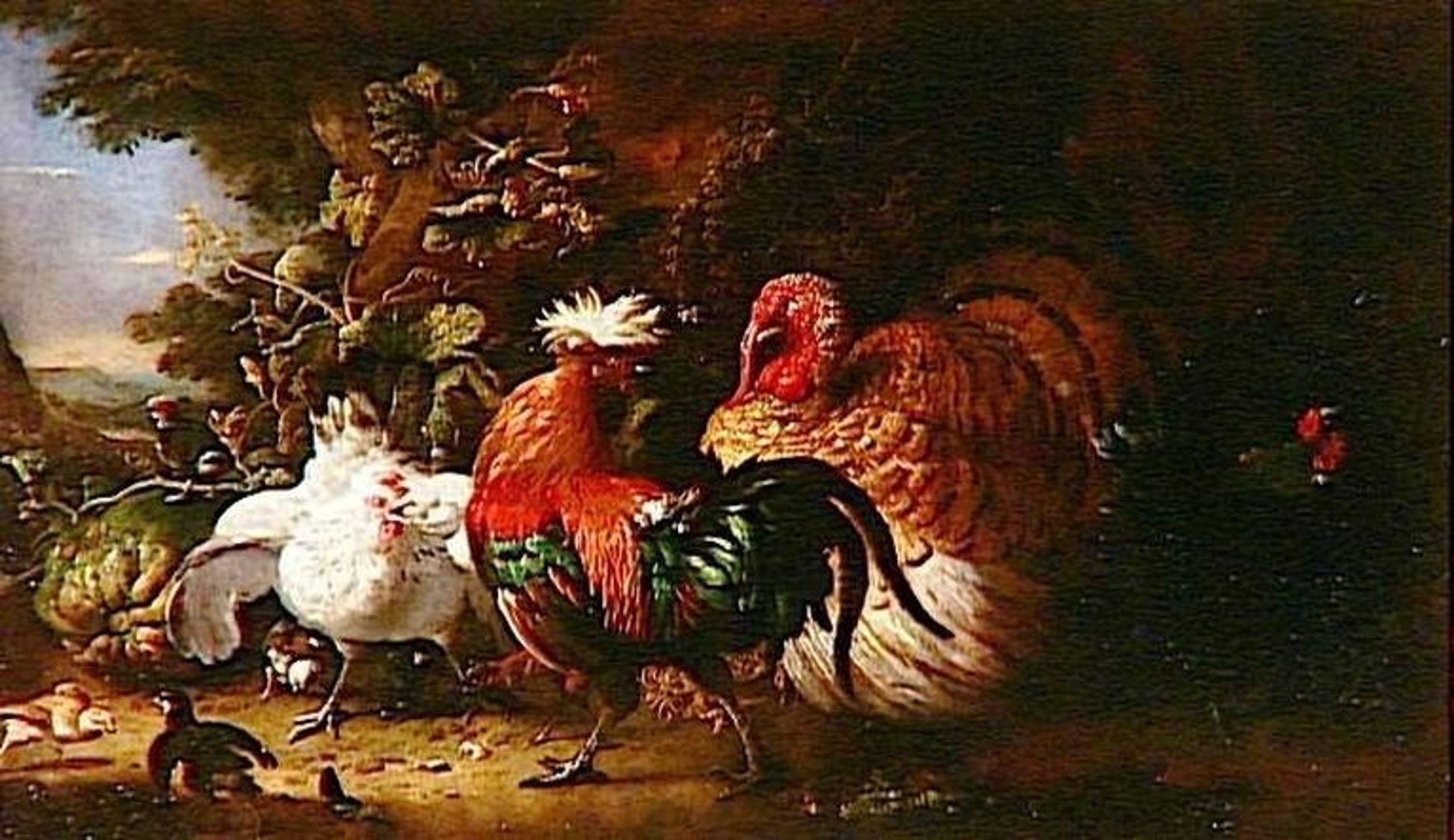 Le tableau représente un grand coq à aigrette blanche et à queue noire, défendant une poule et ses poussins contre un énorme dindon à droite. Cette oeuvre semble dérivée de la composition signée appelée La poule blanche conservée à l’Alte Pinakothek de Münich, et dont il existe plusieurs reprises avec variantes. Dans la version de Münich, le dindon, qui est coupé à mi-corps, se présente de profil, campé sur ses pattes. A gauche, il y a de la végétation et une sorte de barrière en bois, tandis qu’entre le coq et le dindon on aperçoit une chaumière.