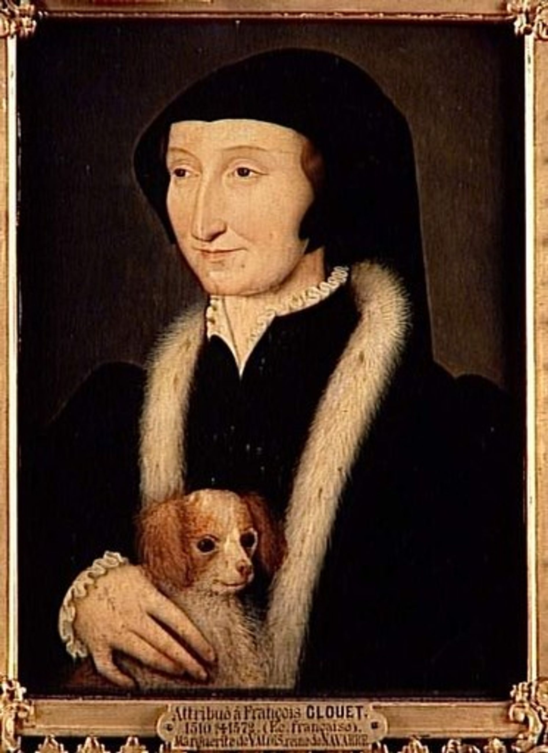 Fille de Charles d’Orléans, comte d’Angoulême, et de Louise de Savoie, Marguerite d’Angoulême (1492-1549), soeur de François Ier, perdit son père avant l’âge de quatre ans. Son mariage avec Charles, duc d’Alençon fut arrangé par le roi Louis XII pour des raisons familiales ; à la bataille de Pavie en 1525, Charles fuit avec son armée et se rendit à Lyon où il mourut la même année, accablé de honte et de chagrin, sans avoir revu son épouse. Marguerite partit rejoindre François Ier en Espagne où il était prisonnier après Pavie et le soigna pendant sa maladie. Elle épousa en secondes noces, en 1526 Henri d’Albret, roi de Navarre, et protégea les Réformés qui trouvèrent un refuge auprès d’elle à Nérac. A la mort de son frère François Ier, elle se retira à Nérac où elle mourut deux ans après lui. Elle fut la mère de Jeanne d’Albret et la grand-mère d’Henri IV. Surnommée « la perle des Valois », elle prêcha la tolérance et fut proche des Réformés sans jamais rompre avec l’Eglise romaine. Poète et écrivain, elle resta célèbre dans le domaine des lettres comme auteur du recueil de nouvelles à la manière de Boccace intitulé L’Heptaméron.