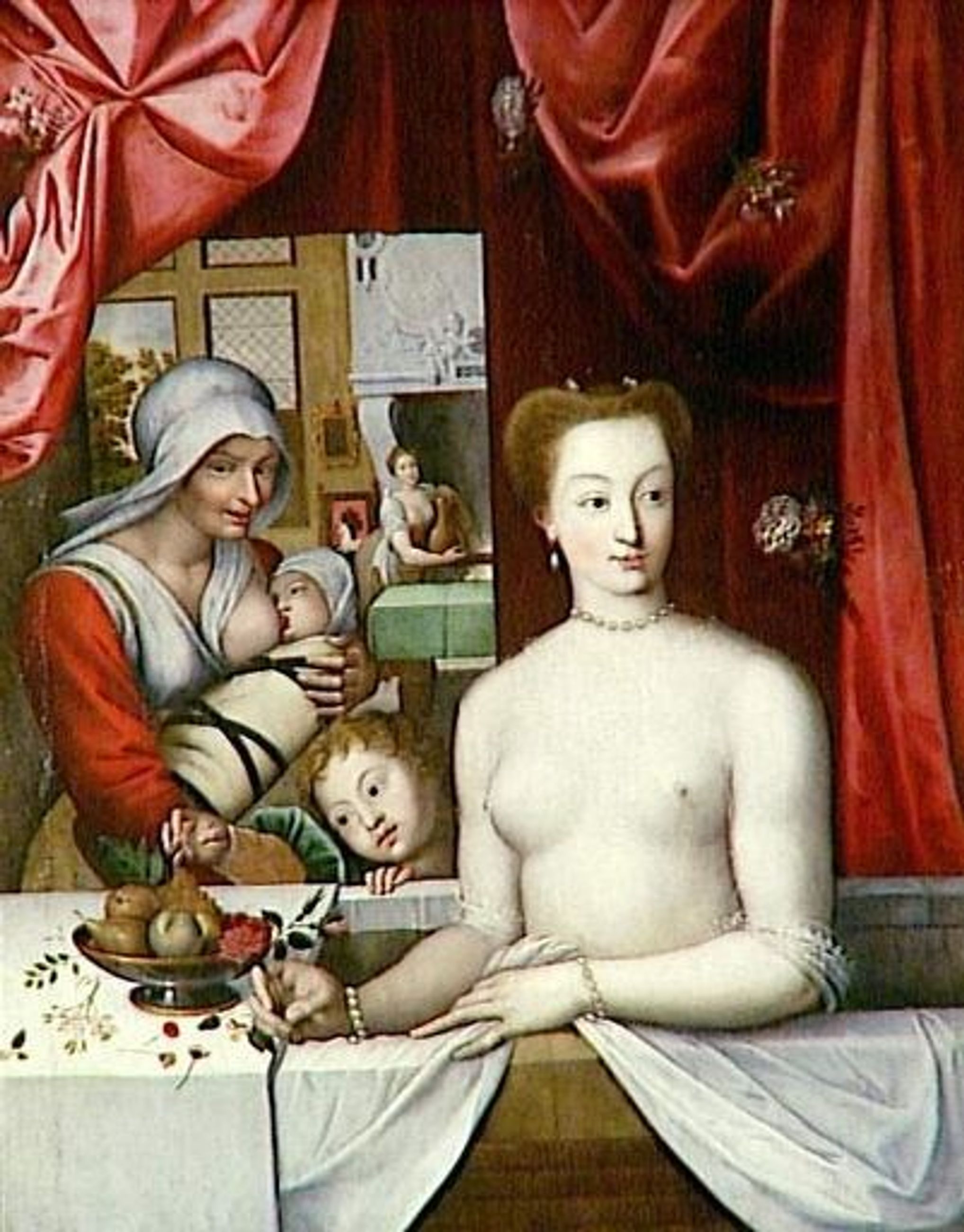 Le modèle représenté est ici Gabrielle d’Estrées, favorite du roi Henri IV, qui lui donna trois enfants dont les deux garçons ici représentés : l’aîné, César, duc de Vendôme, né en 1594, que l’on surnommait « le dauphin bâtard » et le second, Alexandre de Vendôme, né le 19 avril 1598, représenté ici à l’âge au maillot et au sein de sa nourrice, ce qui date le tableau des environs de 1598-1599 (il manque cependant encore Catherine-Henriette, née en 1596, qui ne peut être le poupon au maillot, car l’aîné est un petit garçon âgé de plus de deux ans). Le musée du Louvre conserve un tableau assez proche par le thème qui présente deux femmes au bain dont l’une serait Gabrielle d’Estrées et l’autre sa sœur la duchesse de Villars qui tient la pointe du sein de sa sœur entre le pouce et l’index, ce qui serait peut-être une évocation de la maternité prochaine de Gabrielle ; à l’arrière-plan, comme dans le tableau de Chantilly, on voit une femme travailler à son ouvrage dans un appartement cossu. Le bain est à l’époque une pratique recommandée aux femmes relevant de couches pour préserver leur beauté. L’immersion dans l’eau avait aussi pour but de favoriser la maternité future. Les roses et les perles, attributs de Vénus, permettent de comparer la femme représentée à la déesse de la Beauté. Le tableau est donc un hymne à la beauté et à la fécondité de la maîtresse du roi Henri IV.