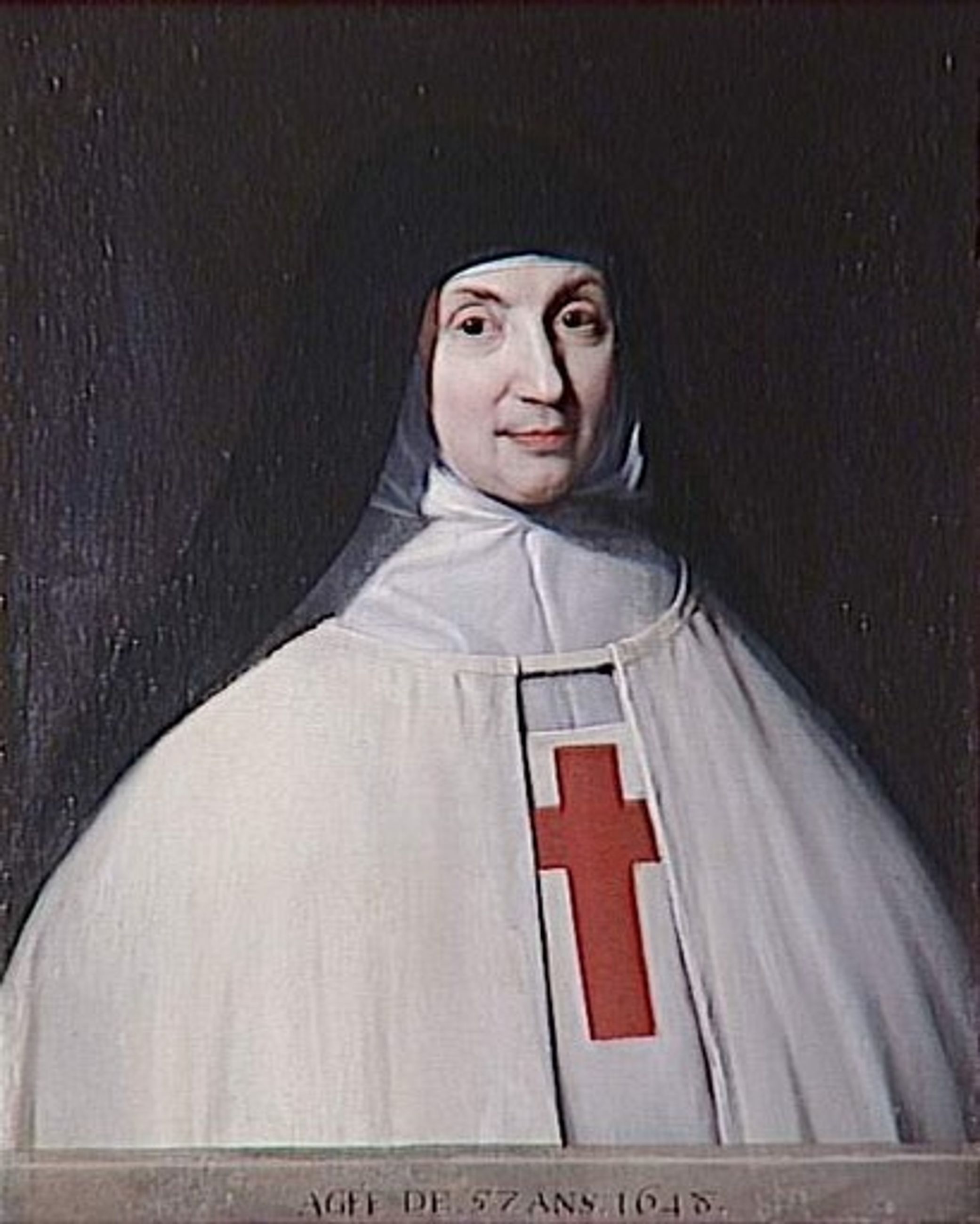 La mère Angélique Arnauld, abbesse de Port-Royal, y développa le jansénisme, courant suivi par les « belles amies » de Port-Royal, Mme de Sablé, Mme de Longueville ou Mme de Sévigné. Née à Tours en 1591, Jacqueline Arnauld prend l’habit de novice en 1599, puis entre à l’abbaye de Maubuisson sous le nom de sœur Angélique et devient abbesse du monastère cistercien de Port-Royal en 1602. Elle y mène d’abord une vie agréable, puis en 1608, frappée par un sermon du P. Basile, elle entreprend la réforme de l’abbaye, rétablissant la règle de saint Benoît et cantonnant ses parents au parloir le 25 septembre 1609 lors de la « journée des guichets ». Elle réforme Maubuisson, puis en 1636 retrouve Port-Royal. En 1648, la communauté étant devenue trop importante, elle s’installe à Port-Royal des Champs avec une partie des religieuses et y demeure jusqu’en 1661, lorsque le roi ordonne de changer les directeurs de l’abbaye, de renvoyer les pensionnaires et de ne plus recevoir de novices. Rentrée à Paris, elle meurt en 1661. Port-Royal était un foyer janséniste, courant de pensée religieuse auquel adhérait Champaigne. En 1648, Philippe de Champaigne met ses deux filles en pension à Port-Royal et peint le portrait de l’abbesse peut-être pour la remercier de les accueillir. Champaigne a réalisé un portrait de Saint-Cyran également placé derrière une balustrade ; il pourrait s’agir de pendants. Champaigne est le peintre des messieurs de Port-Royal, réalisant les portraits d’Antoine Singlin (Los Angeles, The J.Paul Getty Museum) et de l’écrivain Robert Arnauld d’Andilly (Louvre). Dans l’Ex-voto de 1662 (Louvre), Champaigne peint sa fille, sœur Catherine de Sainte-Suzanne, religieuse de Port-Royal, atteinte de paralysie en 1661, retrouvant l’usage de ses jambes suite à la neuvaine ordonnée par la mère Agnès Arnauld, en prières à ses côtés. Il existe au château de Versailles un autre exemplaire du portrait de la mère Angélique Arnauld qui pourrait être l’original. Le tableau de Chantilly, qui a subi une transposition, est très usé, mais l’oeuvre paraît de belle qualité. Il pourrait s’agir d’une réplique autographe par Philippe de Champaigne, ou par son neveu Jean-Baptiste de Champaigne. Elle porte l’habit de Port-Royal, adopté en 1647, voile noir et scapulaire blanc portant la croix. La lourde étoffe du manteau de chœur renforce la raideur hiératique du portrait. La palette est très froide, relevée par le rouge de la croix.