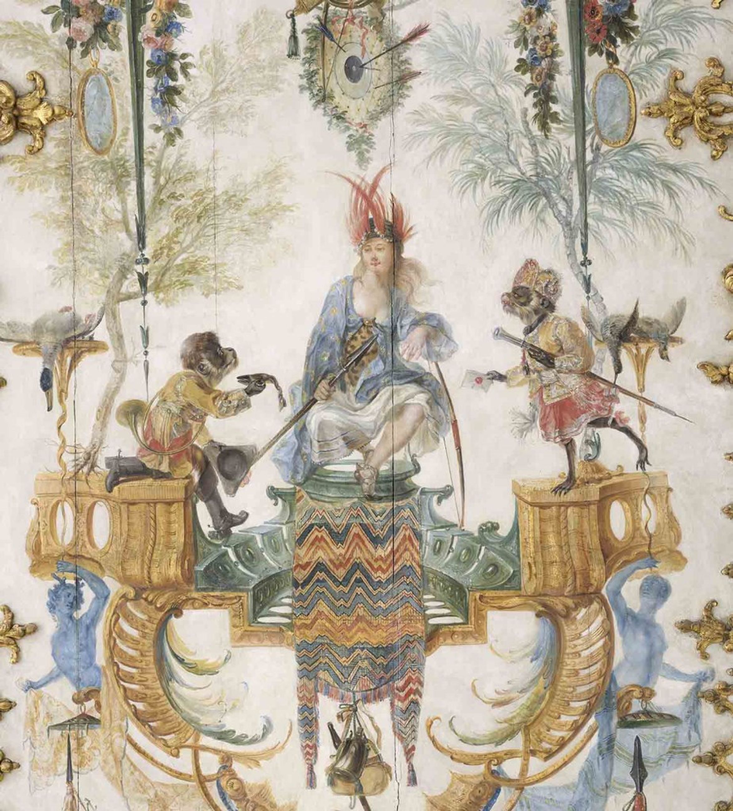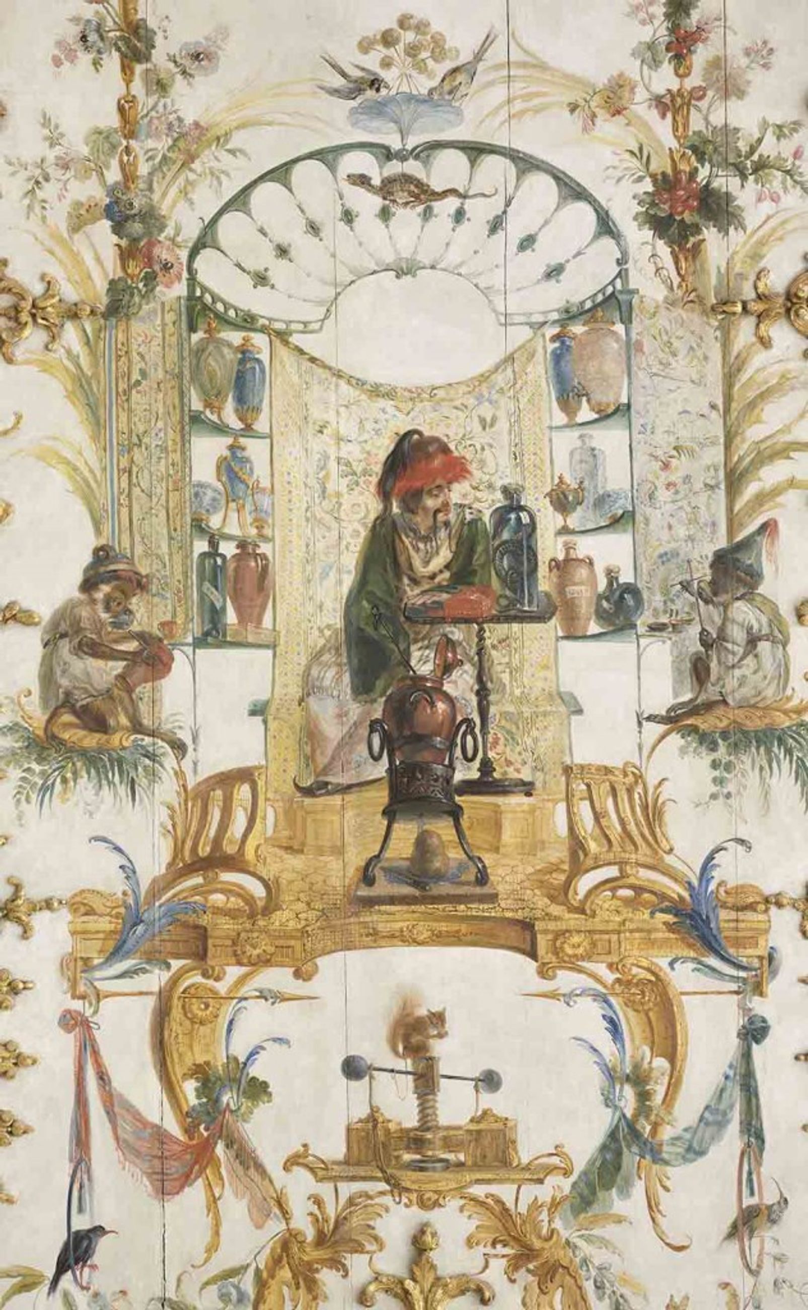 Ce type de décor apparaît à la fin du règne de Louis XIV avec l’ornemaniste Jean Bérain, et se développe avec Claude Gillot, Claude III Audran et leur élève Watteau. Dans le droit fil des singeries flamandes de David Teniers où les singes se livrent aux activités humaines, ces décorations n’hésitaient pas à caricaturer les commanditaires des peintures sous les traits de singes ; ainsi, la Grande Singerie met en scène des singes portant l’habit de vénerie de la maison de Condé où les propriétaires pouvaient se reconnaître sous l’aspect d’animaux facétieux. L’iconographie de la Grande Singerie figurant sur les six grands panneaux muraux est centrée sur les Quatre Parties du Monde et sur les Cinq Sens. Les quatre animaux représentant traditionnellement les quatre parties du monde (le lion, le cheval, l’éléphant, le crocodile) figurent sur les médaillons en camaïeu gris placés de chaque côté des miroirs. Les trois portes à double vantail figurent les Sciences et les Arts, avec le singe peintre, le singe sculpteur, le singe soldat avec le drapeau des Condé, le singe géographe, le singe funambule et le singe musicien ; le plafond évoque la chasse à courre, occupation favorite des princes de Condé à Chantilly, avec une chasse au daim et une chasse au sanglier.