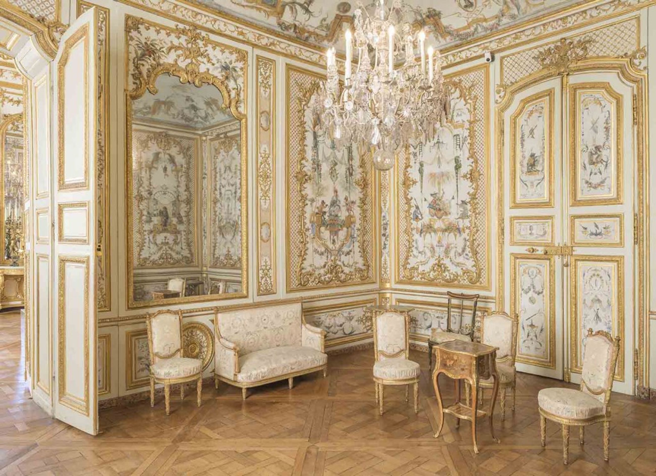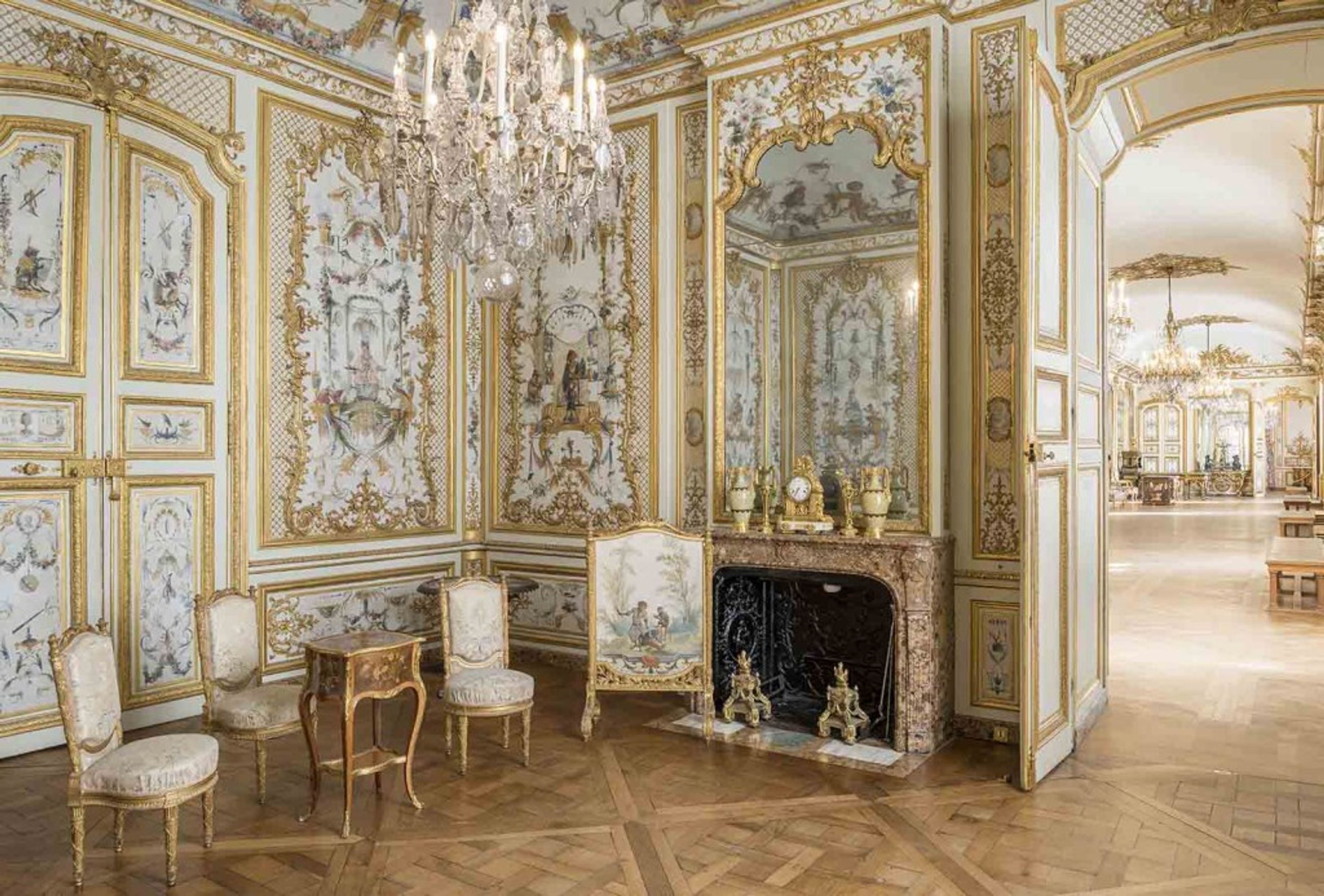 La Grande Singerie est un décor de chinois et de singes peint sur les lambris d’un salon de l’appartement du prince de Condé. Ce décor a été réalisé en 1737, soit près de vingt ans après la création du lambris blanc et or sous la direction de l’architecte Jean Aubert. Au XIXe siècle, ce décor peint était attribué à Watteau, artiste qui a effectivement réalisé ce type de décor dans sa jeunesse. La découverte récente de la date de 1737sur le bloc de marbre que taille le singe sculpteur écarte cette possibilité, et permet d’attribuer cet ensemble à Christophe Huet, peintre animalier élève de Claude III Audran qui travailla pour la famille de Condé dans les années 1735. Christophe Huet est également l’auteur de décors comparables au château de Champs-sur-Marne et à l’hôtel de Rohan-Strasbourg à Paris.