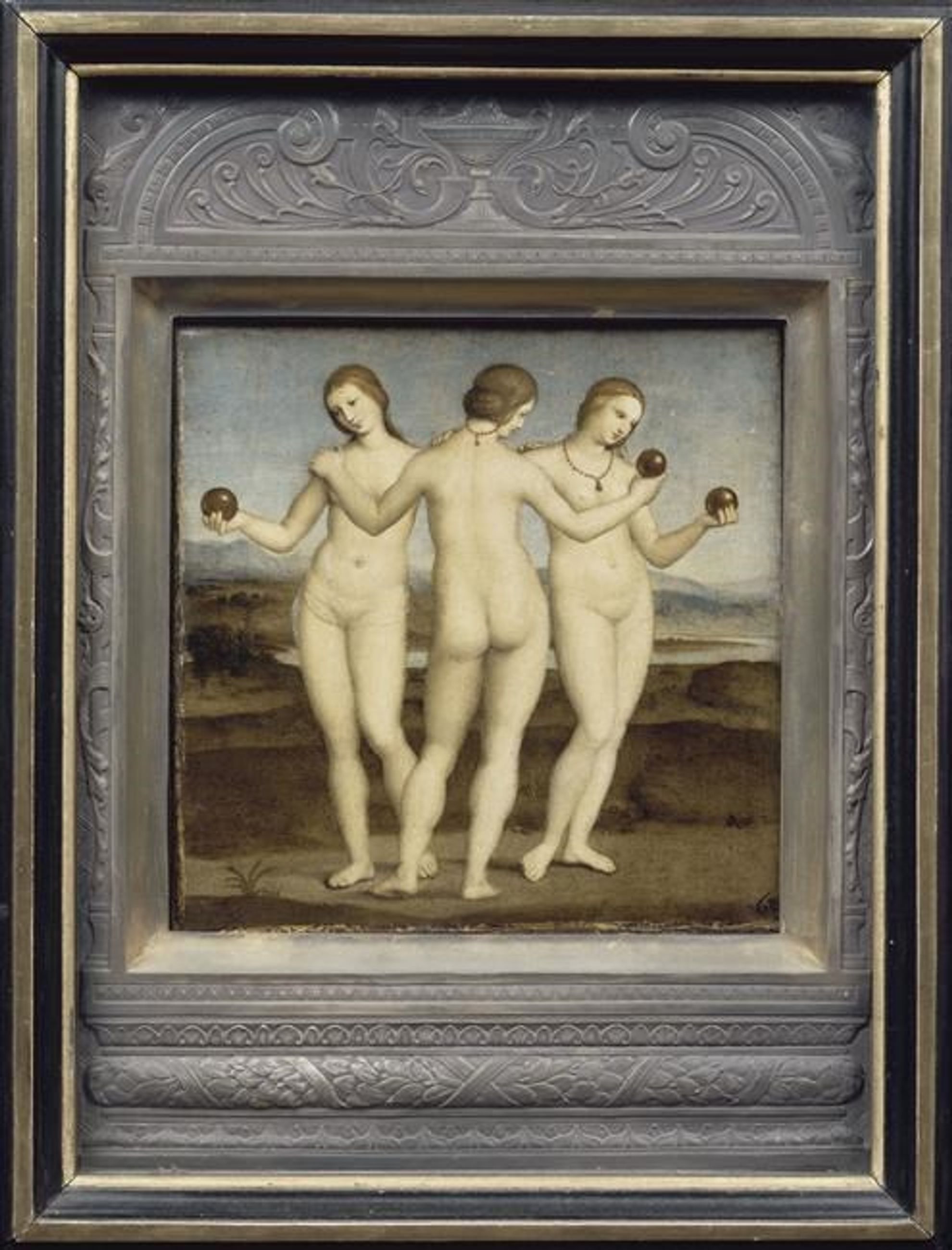 C’est l’un des plus petits tableaux du maître et la seule oeuvre profane de la période florentine de Raphaël, avant 1508, encore sous l’influence de Pinturicchio et de Pérugin. L’attribution à Raphaël n’a jamais été remise en cause. Il apparaît en 1693 sous le nom de Raphaël dans l’inventaire du cardinal Scipion Borghese (1576-1633) aux côtés du Songe du Chevalier (Londres, National Gallery), alors intitulé les Trois Vertus. Il est acquis vers 1800 par Henri Reboul (1763-1839), intendant de la République romaine sous Bonaparte, qui le ramène en France en 1803. Il passe en Angleterre où le duc d’Aumale l’acquiert en 1885. L’analyse scientifique a montré des repentirs ; à l’origine, seule la figure de gauche tenait une pomme d’or, la figure centrale avait le bras posé sur l’épaule de la femme de droite. Dans la mesure où il n’y avait qu’une boule d’or, ce pouvait être un jugement de Pâris avec les trois plus belles déesses de l’Olympe, Diane, Junon et Vénus, le berger Pâris figurant sur le panneau de Londres. Raphaël s’est inspiré d’un marbre antique qui se trouvait en 1502 à Sienne dans la librairie du pape Pie II Piccolomini, et dont un autre exemplaire est au Louvre. Dans la mythologie gréco-romaine, les trois Grâces sont des filles de Jupiter incarnant la beauté, la séduction, la fécondité. Ce sujet, populaire dans l’Antiquité, a été souvent traité à la Renaissance. Les trois globes dorés peuvent faire référence aux Hespérides, filles d’Atlas et d’Hespéris à qui Junon a confié les pommes d’or de l’immortalité, récompense de la vertu, qu’Hercule dut conquérir au cours de ses travaux, malgré le dragon qu’Héra avait placé dans le jardin pour les protéger. Les trois boules d’or pourraient faire allusion aux armes des Médicis et symboliseraient l’image du courtisan : « Sagesse, Pouvoir, Beauté » définie par Balthazar Castiglione dans le Courtisan, livre élaboré lors d’un séjour à Urbin entre 1503 et 1506 dans lequel on reconnaît Giuliano de Médicis qui serait alors le commanditaire du tableau. Le Songe du Chevalier, pendant des Trois Grâces, est lui aussi différemment interprété. Il montre peut-être le Songe de Scipion l’Africain, poème antique de Silius Italicus célèbre à Florence au XVIe siècle : Scipion doit choisir entre la voie difficile de la vertu et celle, plus souriante, de l’amour et des plaisirs. Les Trois Grâces, tenant les pommes d’or du jardin des Hespérides, symbole d’immortalité, représentent la récompense de l’homme vertueux. Il pourrait s’agir aussi de la représentation antique d’Hercule à la croisée des chemins entre Amour et Devoir, sous la forme de deux allégories féminines. Ce serait une exhortation à la vertu pour le jeune Scipion Borghese, né en 1493, à l’occasion de sa communion en 1500. Le panneau de Londres évoquerait les vertus masculines (Justice, Force, Tempérance) et celui de Chantilly les vertus féminines (Amour, Beauté et Pudeur).