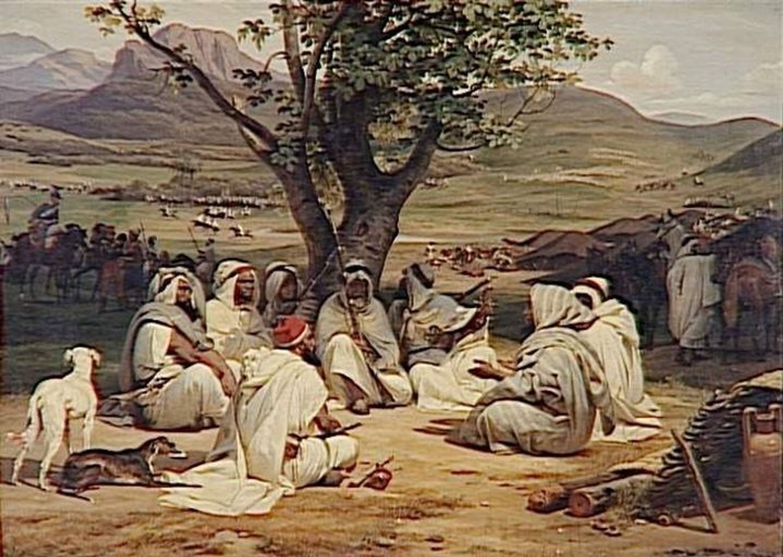 C’est le premier sujet orientaliste qu’Horace Vernet, peintre officiel du régime de Louis-Philippe, ait exposé au Salon. Il l’exécuta alors qu’il était directeur de l’Académie de France à Rome, après s’être rendu en Algérie en mai 1833 à bord du brick La Comète mis à sa disposition par le comte de Rigny, ministre de la Marine. Il resta une dizaine de jours à Alger et rencontra le général Yusuf. Il réalisa cette réplique avec variantes de la toile au moment même où l’original (Londres, Wallace Collection, daté : Rome 1833) se trouvait exposé à Paris au Salon de 1834. Le tableau se trouvait donc confronté aux Femmes d’Alger dans leur appartement d’Eugène Delacroix. L’esprit en est différent ; le tableau montre le déploiement des troupes françaises en Algérie, mettant en évidence, non sans quelques arrière-pensées politiques, la bonne entente qui semble régner entre l’armée de Louis-Philippe et les tribus algériennes qui lui donnent une fantasia à l’arrière-plan à gauche. Les chefs algériens sont réunis en conseil au pied d’un figuier, et présentent les différentes ethnies de l’Algérie. Le duc d’Aumale devait retrouver dans ce tableau une partie de son passé algérien (les tentes à l’arrière-plan à droite ne sont pas sans évoquer la prise de la Smalah d’Abd el-Kader le 16 mai 1843, principal fait d’armes du duc d’Aumale en Algérie alors qu’il n’avait que vingt-et-un ans). Le prince acquit ce tableau à l’hôtel Drouot en 1876 après la mort d’Horace Vernet.