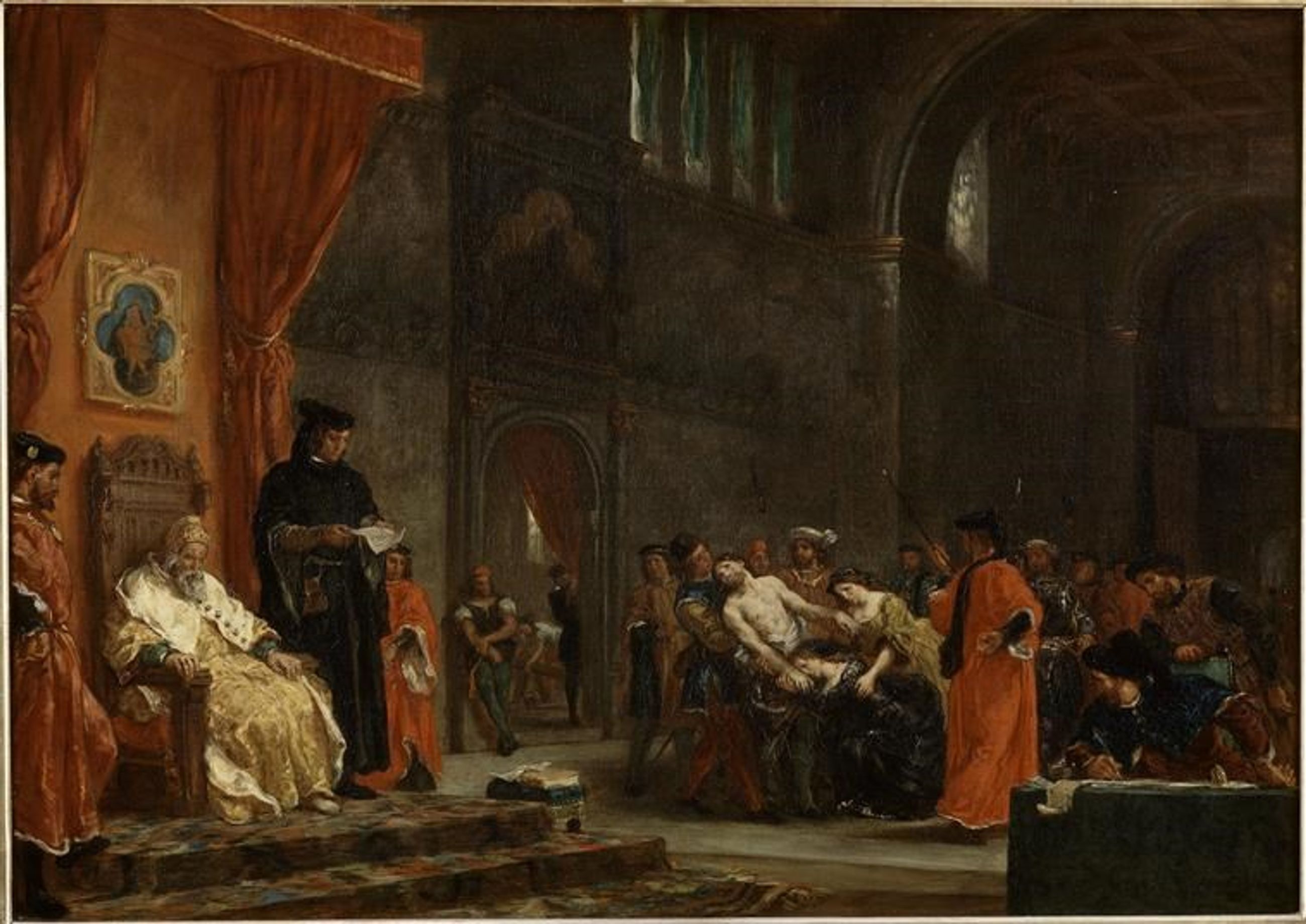 La scène est tirée de l’histoire de Venise au XVe siècle ; le doge Francesco Foscari, élu en 1423, avait conduit Venise dans des guerres interminables contre le Turc au cours desquelles il avait perdu trois fils ; le dernier, Jacopo, fut dénoncé au Conseil des Dix pour trahison et intelligence avec l’ennemi. Torturé le 20 février 1445 et ayant avoué son crime, il fut condamné au bannissement perpétuel. Le doge, écrasé de honte et de douleur, assiste ici à la lecture du jugement qui frappe son dernier fils. Revêtu de ses vêtements d’apparat et coiffé du corno, symbole de la Sérénissime République, accablé il garde la tête basse, tandis que son fils, torse nu au centre de la composition, implore sa pitié et que la femme de celui-ci s’accroche à lui. Au fond à gauche, le bourreau et ses aides ; à droite, juges et notables de Venise. Le livret de l’Exposition Universelle de 1855, à laquelle fut présentée ce tableau, expliquait longuement cet épisode peu connu de l’histoire de Venise.