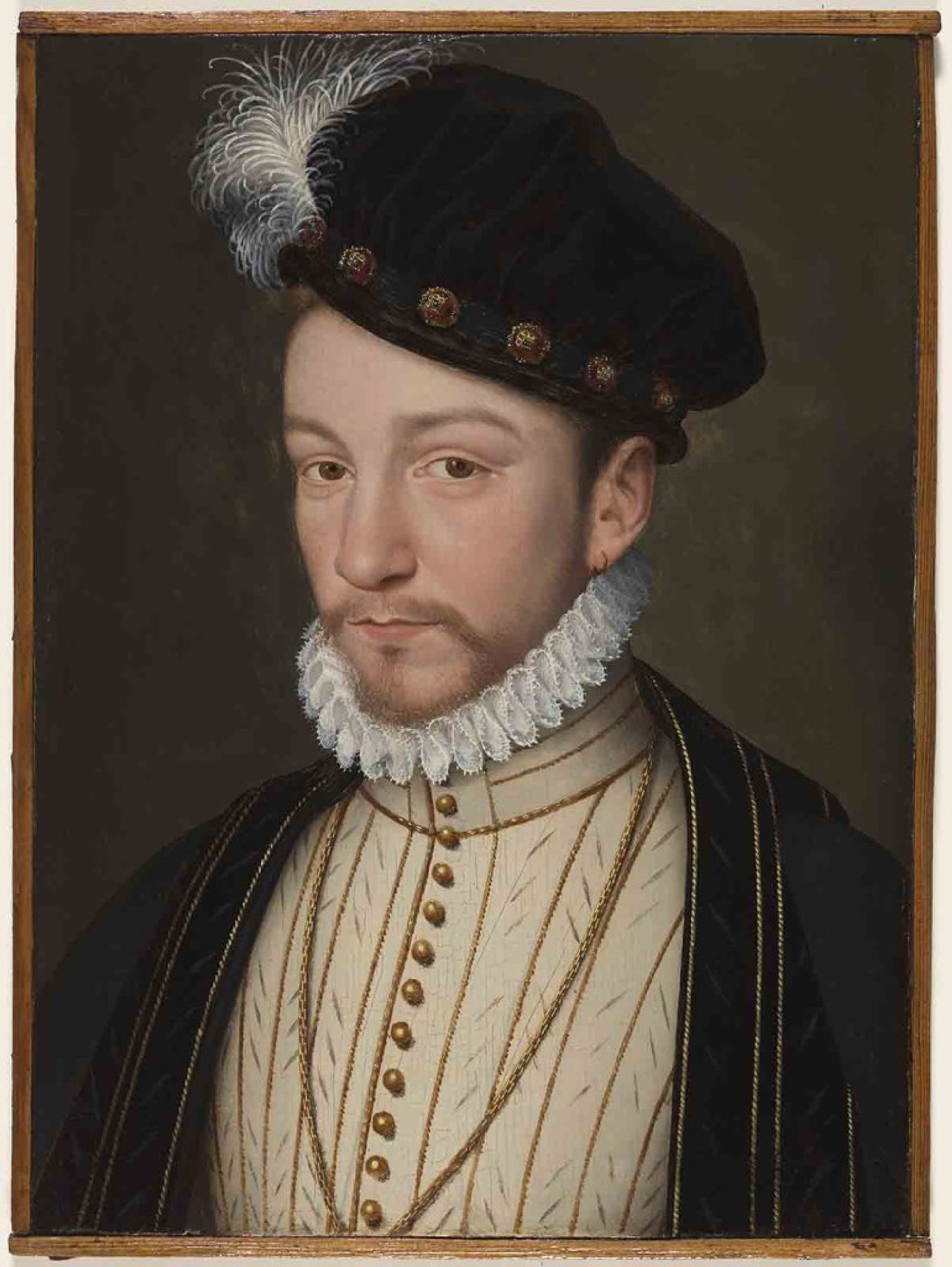 L’année de son mariage (1570-1571), trouvant ses portraits officiels réalisés jusqu’alors trop juvéniles, Charles IX commanda à François Clouet une nouvelle effigie. L’artiste conserva les contours de l’image antérieure, datant de 1569, mais le roi arborait désormais une petite moustache et une barbe taillée en pointe qui le faisaient paraître plus mûr, ainsi qu’un pendant à l’oreille gauche à l’imitation de son père, Henri II. En dehors du portrait des Biencourt, acquis par le marquis en 1821 dans une galerie parisienne en même temps qu’un Richelieu par Philippe de Champaigne, deux autres versions seulement de cette iconographie sont connues : un dessin préparatoire (musée de Göttingen, H 378) et une peinture montrant le roi vêtu de noir (collection particulière). Ici, il porte un habit étonnamment sobre composé d’un collet (vêtement de dessus) de soie ivoire orné de taillades, d’une toque haute et bouffante et d’une cape de velours noir. Ce portrait ne semble pas avoir été diffusé aussi largement que l’image de 1569 car Charles IX, insatisfait, voulut se faire vieillir davantage : dans la nouvelle effigie peinte par Clouet vers 1572 – dont Chantilly possède une belle variante d’atelier issue de la collection du duc d’Aumale (PE 269) – il paraît trentenaire, alors qu’il n’avait que vingt-deux ans.