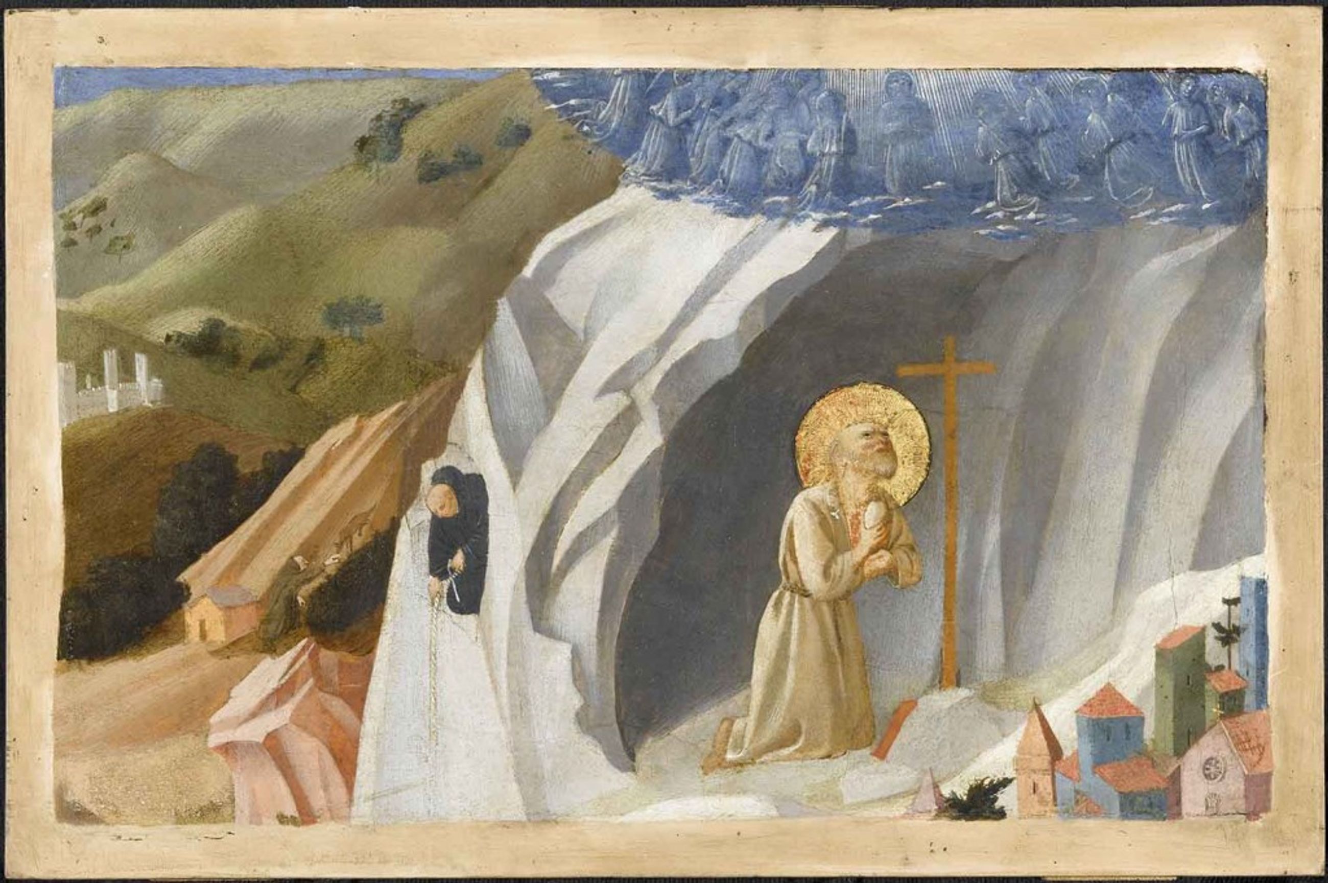 Saint Benoît est représenté au désert, agenouillé dans sa grotte à Subiaco, en prières devant la Croix ; il a alors la vision d’un choeur d’anges représenté à la partie supérieure. Il est aujourd’hui établi, grâce à une fente transversale en haut du panneau, que le panneau est un fragment d’un même ensemble dont les autres éléments sont conservés au musée Thomas Henry de Cherbourg (Saint Augustin en prière), au musée royal des Beaux-Arts d’Anvers (L’apparition de saint Romuald à Otton III) et enfin, pour la partie inférieure, au Philadelphia Museum of Art (Grégoire le Grand refusant la tiare). On pensait jusque-là qu’il s’agissait d’une prédelle, mais la découverte d’un cinquième panneau inédit, La Thébaïde (coll. part.) a montré qu’il s’agissait d’un panneau consacré à la vie des saints ermites présentés sur deux niveaux. La composition a été découpée à des fins commerciales, et il manque encore un fragment. Le panneau de Philadelphie prolonge le village visible en bas et à droite sur le panneau de Chantilly, que la restauration récente a permis de dégager. Le panier que le moine descend au bout d’une corde est visible sur le panneau de Philadelphie.