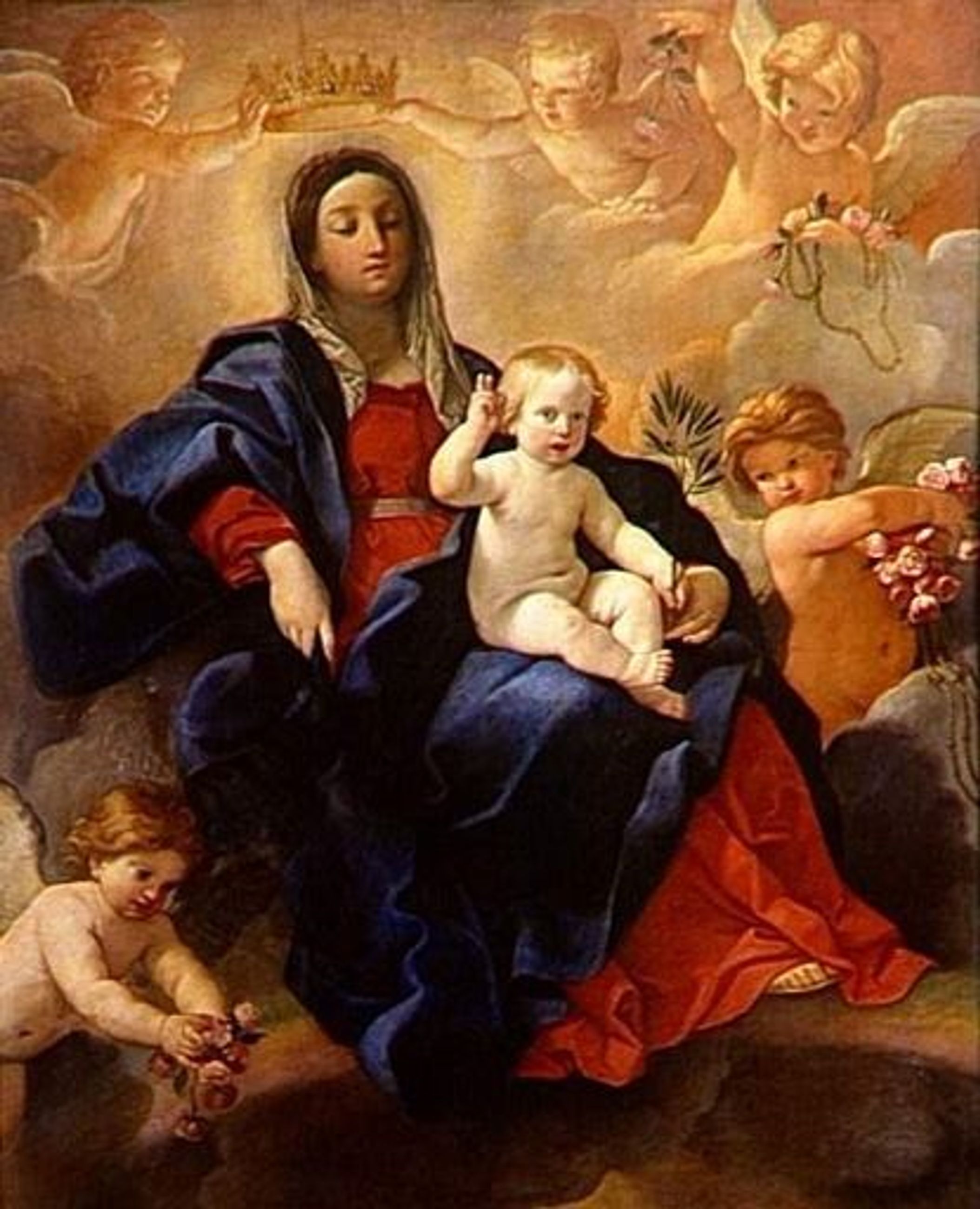 Ce tableau était connu sous le nom de « Madone de la Paix » dès 1803 et aurait été gravé sous ce nom en Italie. Il s’agit d’une réplique partielle d’un retable appelé l’Ex-voto de la peste (Bologne, Pinacoteca Nazionale), qui fut commandé en 1631 par le Sénat de la ville de Bologne et qui était exposé une fois l’an dans la chapelle du rosaire de l’église San Domenico. Ce grand tableau d’autel, très célèbre de son temps, montre sur trois niveaux, selon une iconographie courante dans la peinture de la Contre-Réforme, en bas les simples mortels, au milieu les saints intercédant auprès de la Vierge à l’Enfant entourée d’anges, placée tout en haut. En l’occurrence, le tableau fait allusion à la peste, avec à la partie inférieure les corbillards aux portes de Bologne, et les saints protecteurs de la ville jouant un rôle d’intercession. Le tableau du musée Condé est une réplique de la partie supérieure de ce tableau célèbre avec quelques variantes : les angelots, que l’on ne voit qu’à mi-corps, posent sur le front de la Vierge une couronne de métal et non de roses ; l’Enfant Jésus ne tient qu’un rameau d’olivier mais pas de rose comme dans le tableau de Bologne. L’iconographie n’a plus de rapport avec la peste ni avec la Vierge du Rosaire ; la composition est centrée sur l’Enfant Jésus bénissant qui tient un rameau d’olivier, symbole de paix. L’attribution à Guido Reni paraît donc confirmée, bien que certaines parties plus faibles comme les deux anges de droite aient pu être réalisées par l’atelier. Cette réplique a été probablement commandée peu après la réalisation de l’ex-voto, vers 1631-1632.