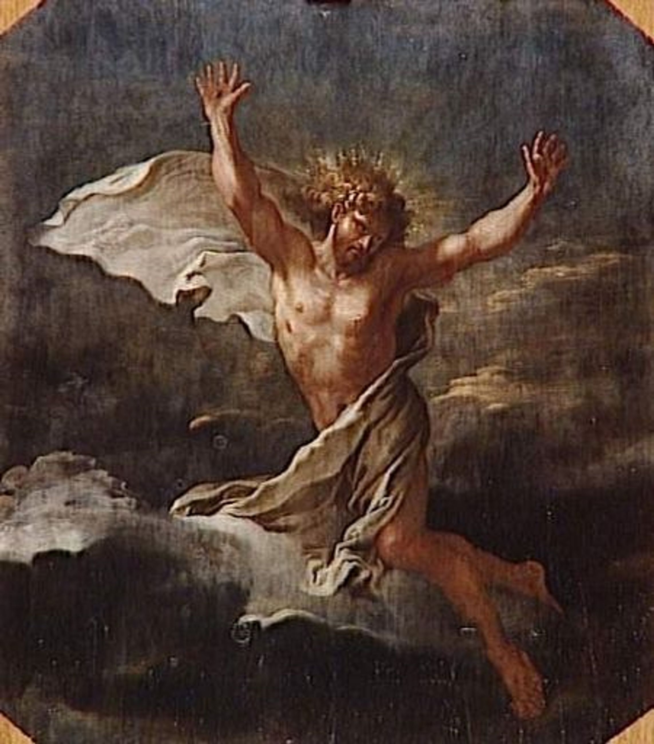 Le tableau appartient à l’ensemble exécuté pour C. de Rossi pour l’église Santa Maria in Montesanto à Rome et mis en place en 1677. Il semble en effet s’être trouvé dans la chapelle du Crucifix de cette église ; dès 1681, il est mentionné par Baldinucci aux côtés de quatre autres tableaux dans cette chapelle, et non pas sur le maître-autel comme il a parfois été écrit à tort. Pour certains, le fait qu’il s’agisse d’un panneau peint sur bois et non d’une toile serait la preuve qu’il s’agirait d’une copie de l’original perdu. Comme ses pendants, il fut déposé en 1802 et acquis la même année par D. Venuti pour le roi de Naples. Il fit ensuite partie de la collection de Salerne.