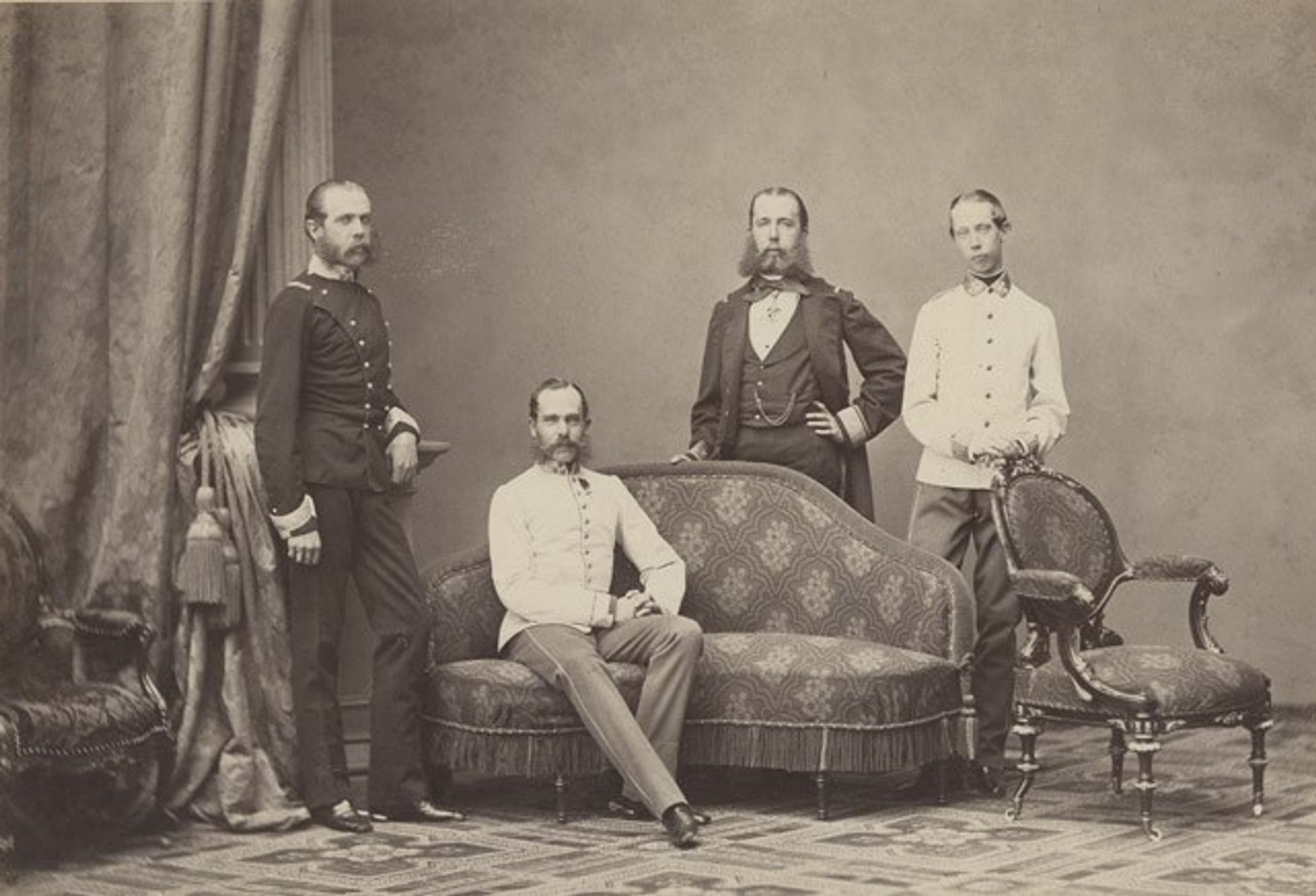 L'empereur François Joseph Ier (1830-1916), l'archiduc Charles-Louis, l'archiduc Louis-Victor, l'archiduc Maximilien (1832-1867), depuis empereur du Mexique (1864-1867)