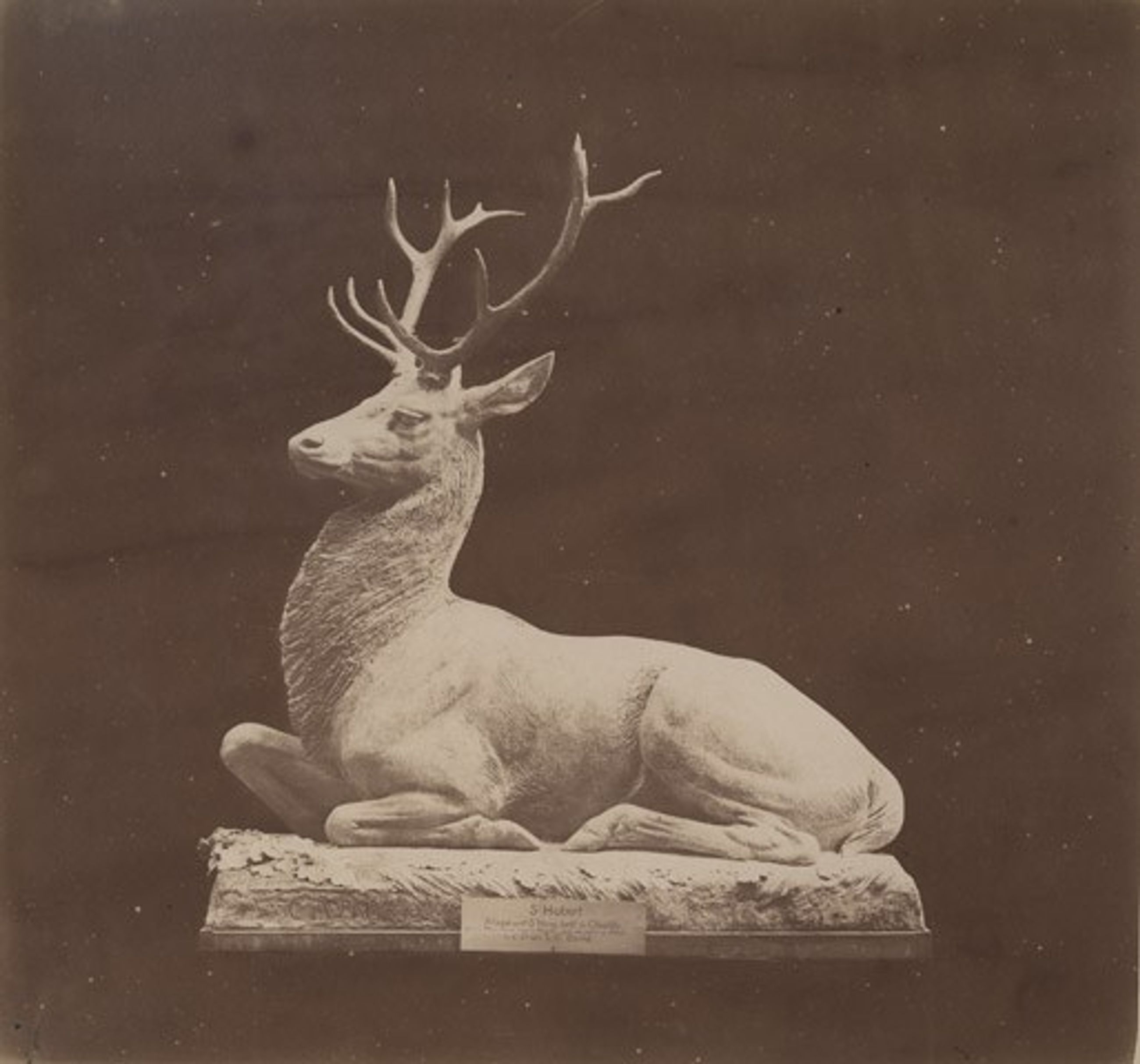 Cerf assis par Auguste Cain.1890 : Saint Huber attaqué au carrefour Saint-Remy forêt de Chantilly près de la Thève dans le village de Mongrésin après une partie de chasse le 4 9bre 1876 L.C. par Dupré