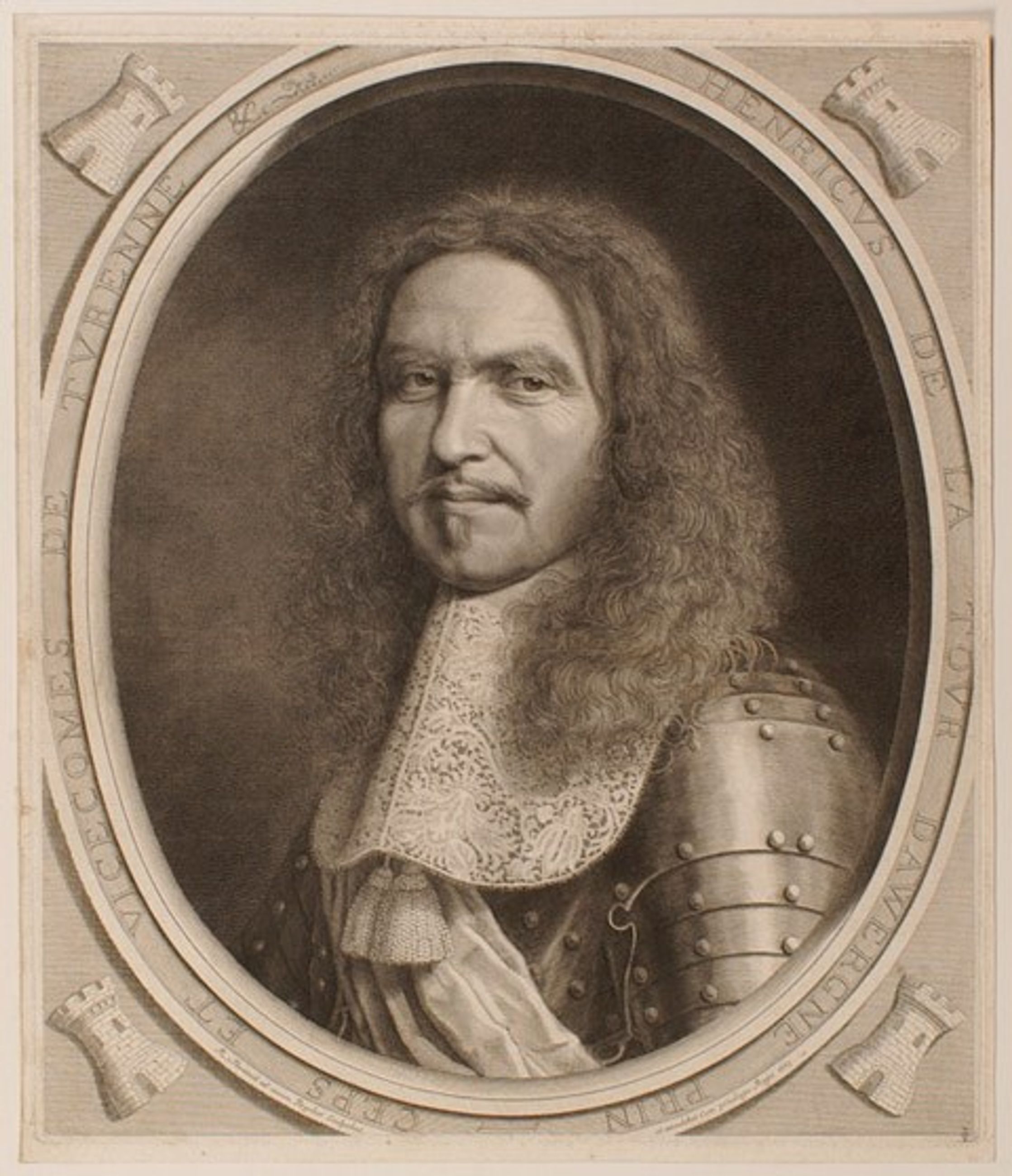 Turenne (Henri de la Tour d'Auvergne vicomte de) (Sedan, 1611 ; Sasbach, 1675) dans un ovale, chaque angle est garni d’une tour ombrée
