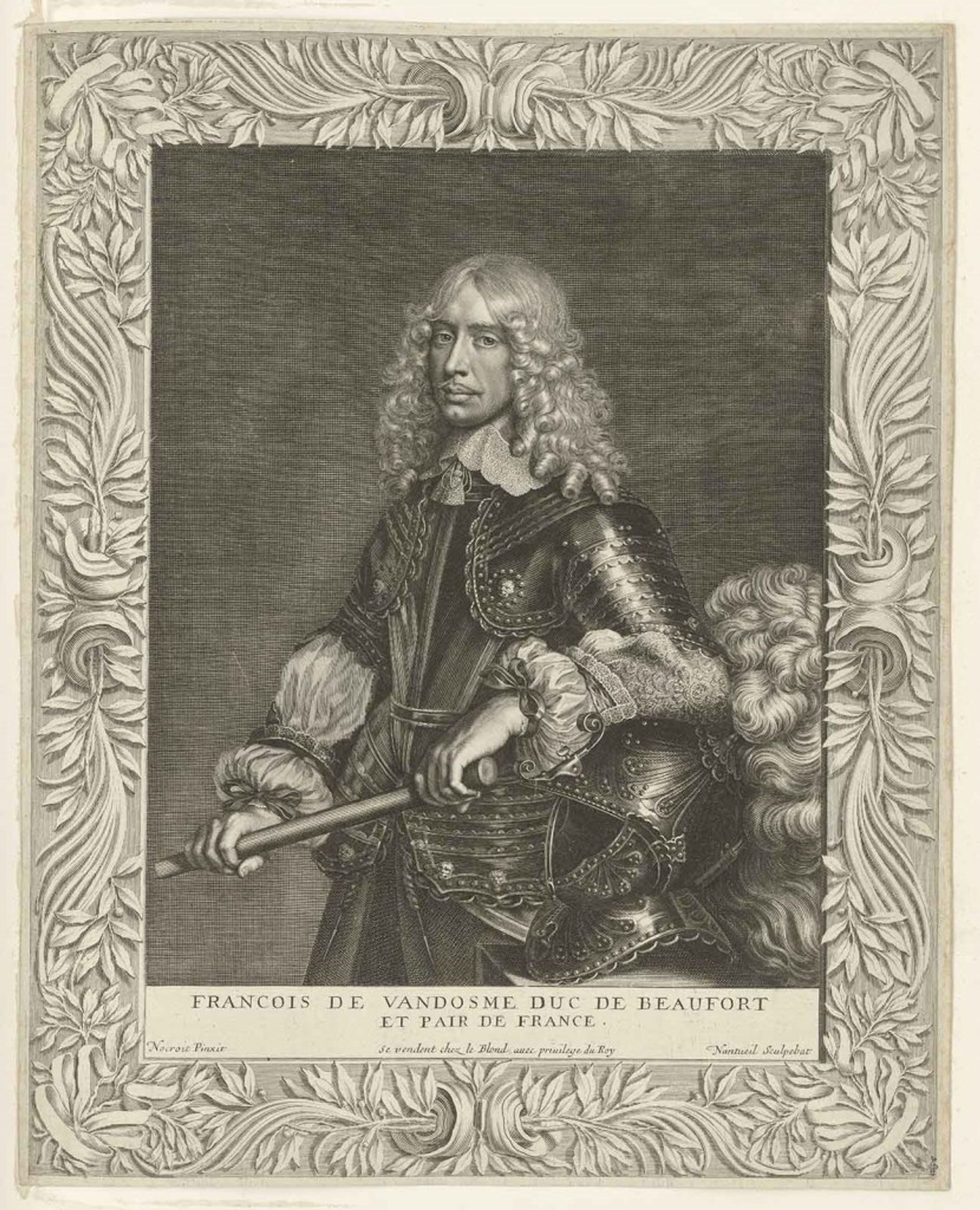 François de Vendôme duc de Beaufort (1616 ; 1669) militaire français représenté debout en cuirasse, entouré d’une large bordure ornée de palmes et branches de laurier